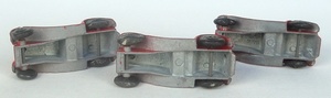 A deilghtful trio of charming, bright red, simply-moulded M.G. Midget models in all original condition with silver trim. Not a trace of sunfading, these MG models have remained in the trade box for the past 60 years, untouched for long periods of time. So, some of the original black rubber tyres have flat spots now. Few little marks to the paint finish.