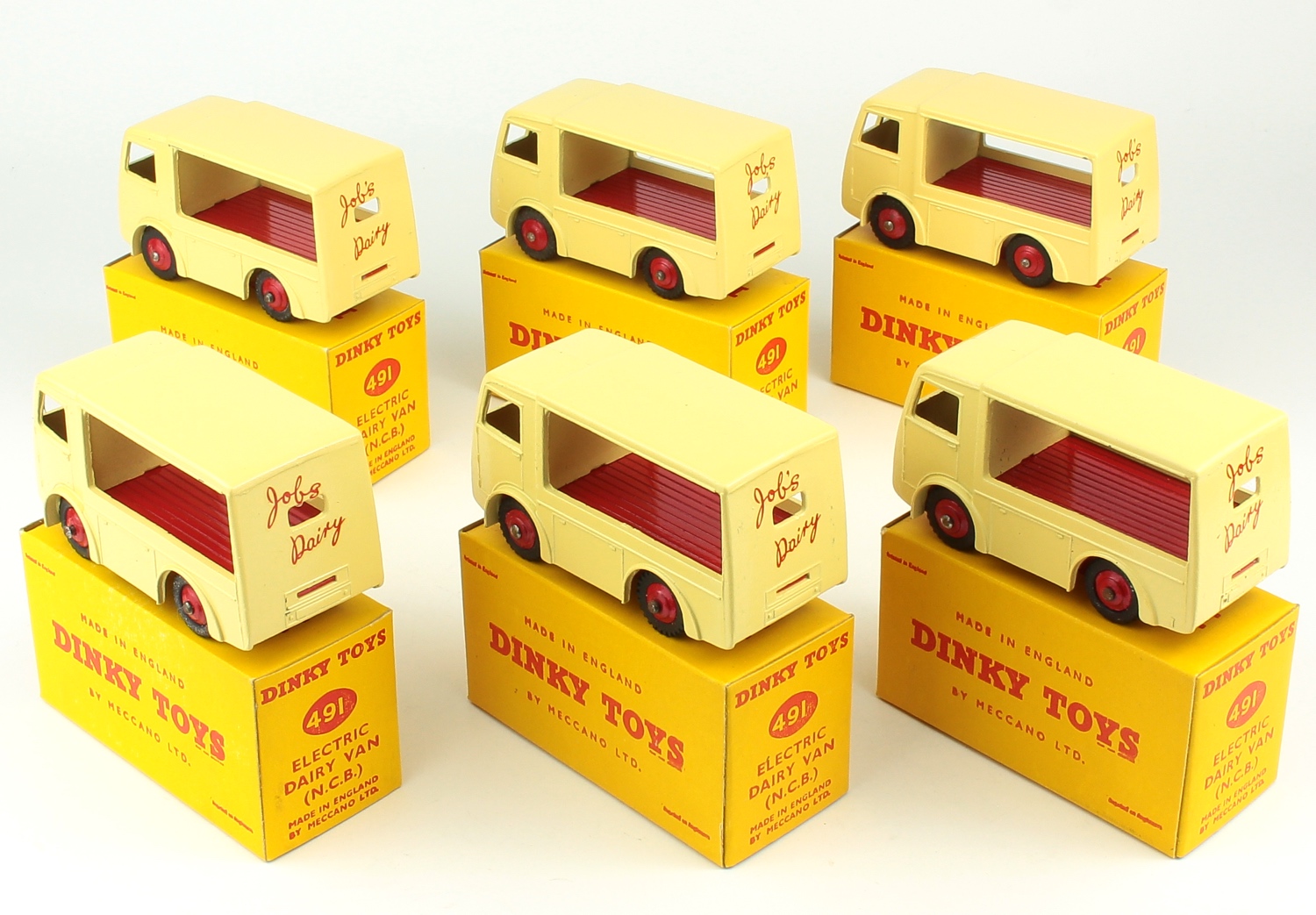 Old shop Trade Pack containing all six original Dinky 491 Electric Dairy Vans "Job's Dairy". Very, very near mint/boxed. Rare promotional Dinky models. Exceptional unsold item with super-crisp boxes.