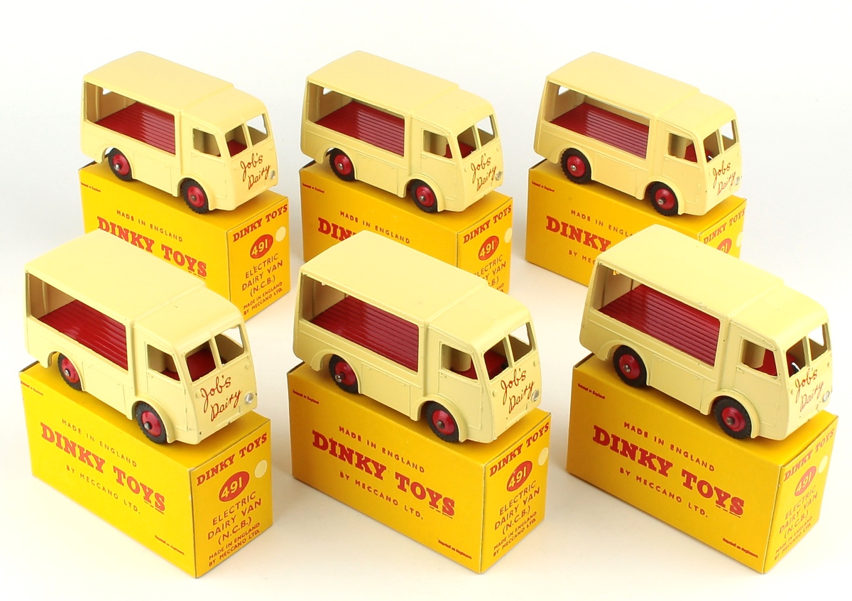 Old shop Trade Pack containing all six original Dinky 491 Electric Dairy Vans "Job's Dairy". Very near mint- very, very near mint/boxed. Rare promotional Dinky models. Exceptional unsold item with super-crisp boxes.