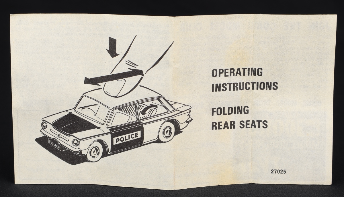 Dark blue roof light, detailed cast wheels, tan interior, opening rear window, Police driver, tilting seats, jewelled headlights. Tiny edge nick to the ‘POLICE’ label at the front bumper.