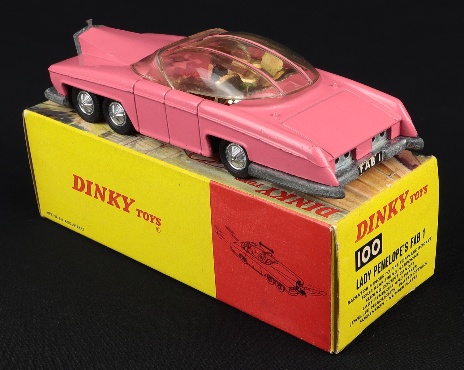 Lady Penelope's Fab 1 by Dinky Toys, No. 100. Very near mint/boxed. Sought-after early issue in rose pink, with pink roof stripes. Mustang-style wheels. With accessories. From The Berlin Collection. Starting bid £200. Please note that QDT apply 12.5% buyer's commission.