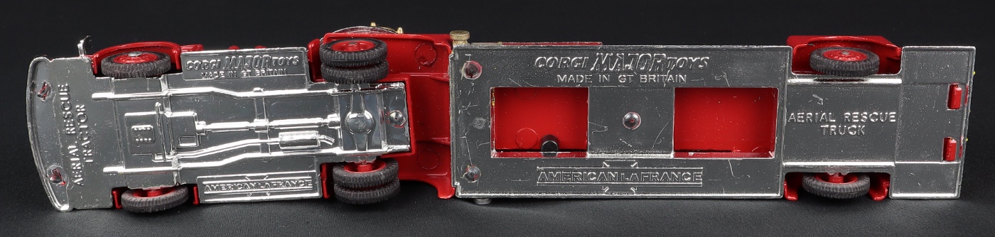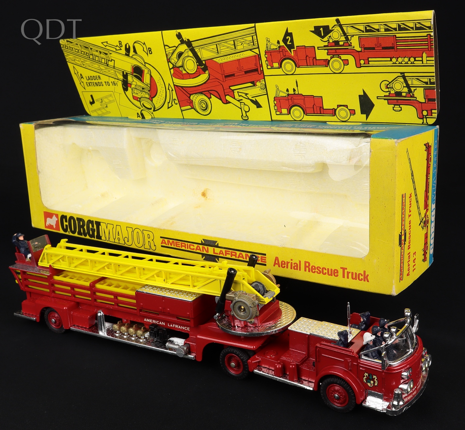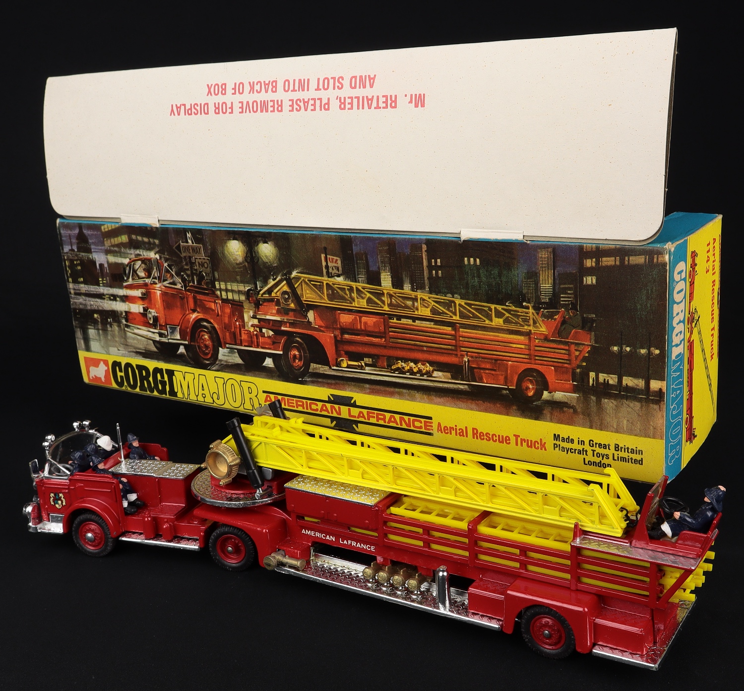 American La France Aerial Rescue Truck by Corgi Toys, No. 1143. Scarce with RED WHEELS. Very near mint/boxed (early window box) with Retailer Card/Header Card. Fine example from The Elmer Collection.