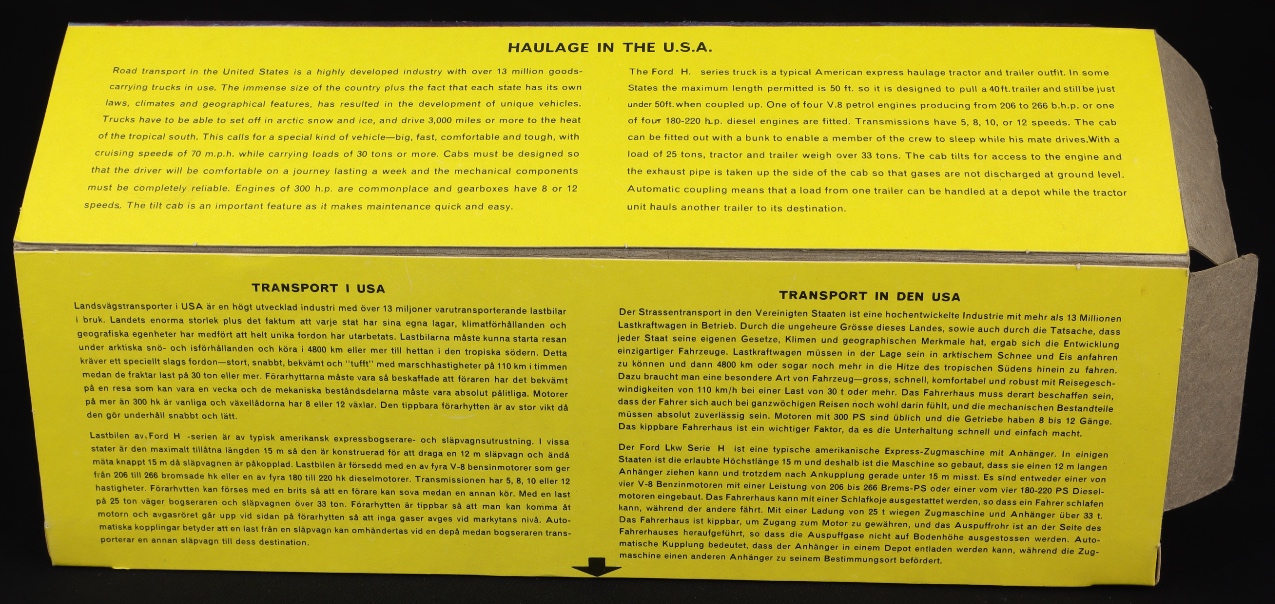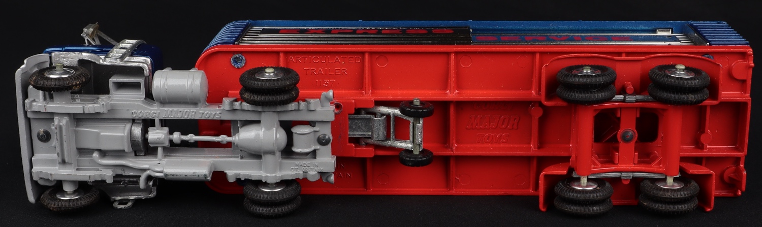 Issued between 1966-69, this Ford articulated truck is a delight! In very close to mint condition, this truck gleams. Complete with both wing mirrors intact (including the little reflective ‘mirror’ pieces), straight gold-coloured horns on the cab roof, and perfect “EXPRESS SERVICE” detailing on both sides of the bright silver, untarnished sliding doors. So eye-catching and it comes complete with the original mechanic figure, too.