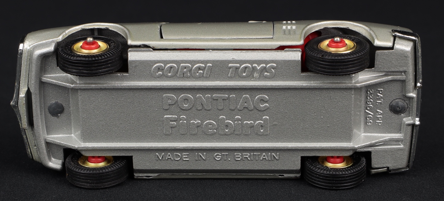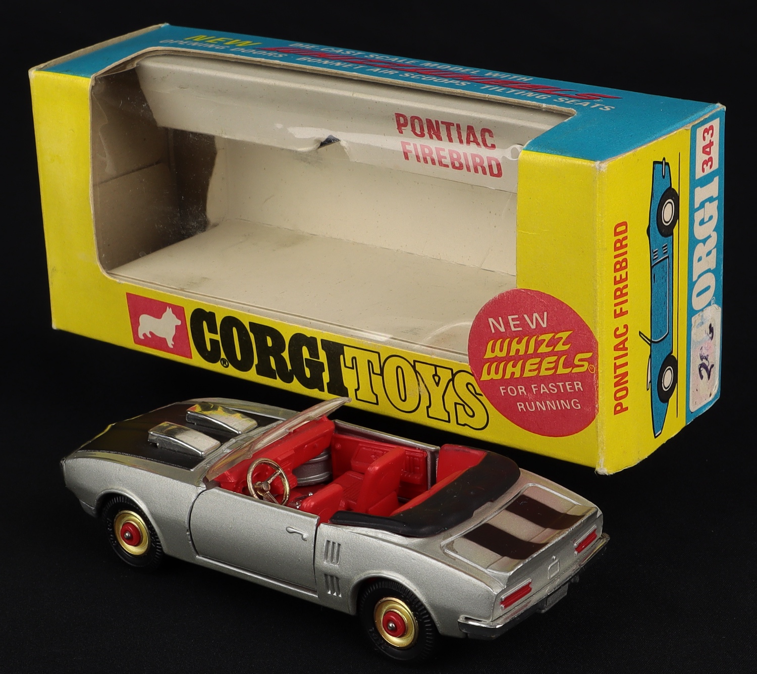 Pontiac Firebird by Corgi Toys, No. 343. Very, very near mint/boxed. *Red Spot wheels version* with ALL-WHITE inner (incomplete). Scarce! From The Gower Collection.