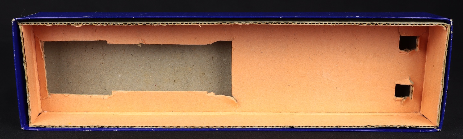 This tank transporter is in 1:55 scale, and was issued between 1959-63. Matt original finish is in military olive green with convex wheels and treaded tyres (including the spare stowed behind the cab). Smooth black tyres on the transporter section (including the spare which has some surface splitting). Window glazing. All parts complete and intact including the drop down ramps on the trailer. Bright baseplate and metal parts. The paint finish has a little surface ‘mottling’ in places – hard to find a mark otherwise.