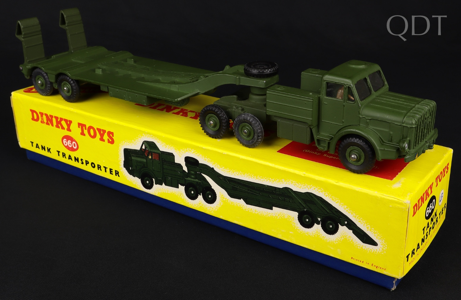 Tank Transporter by Dinky Toys, No 660. Very near mint/boxed. With all packing pieces. Yellow lift-off lid box. From The Berlin Collection.