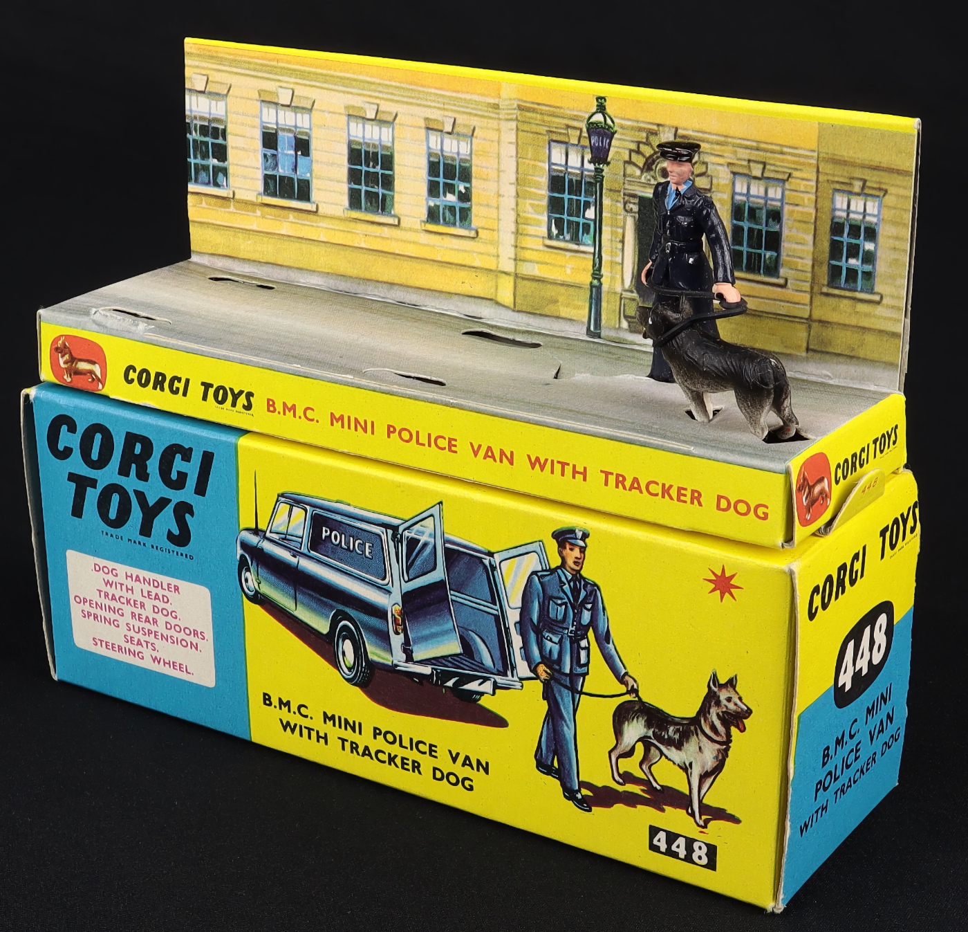 B.M.C. Mini Police Van With Tracker Dog by Corgi Toys, No. 448. Very near mint/boxed, with packing. More unusual find with CAST WHEELS. From The Heart of England Collection.