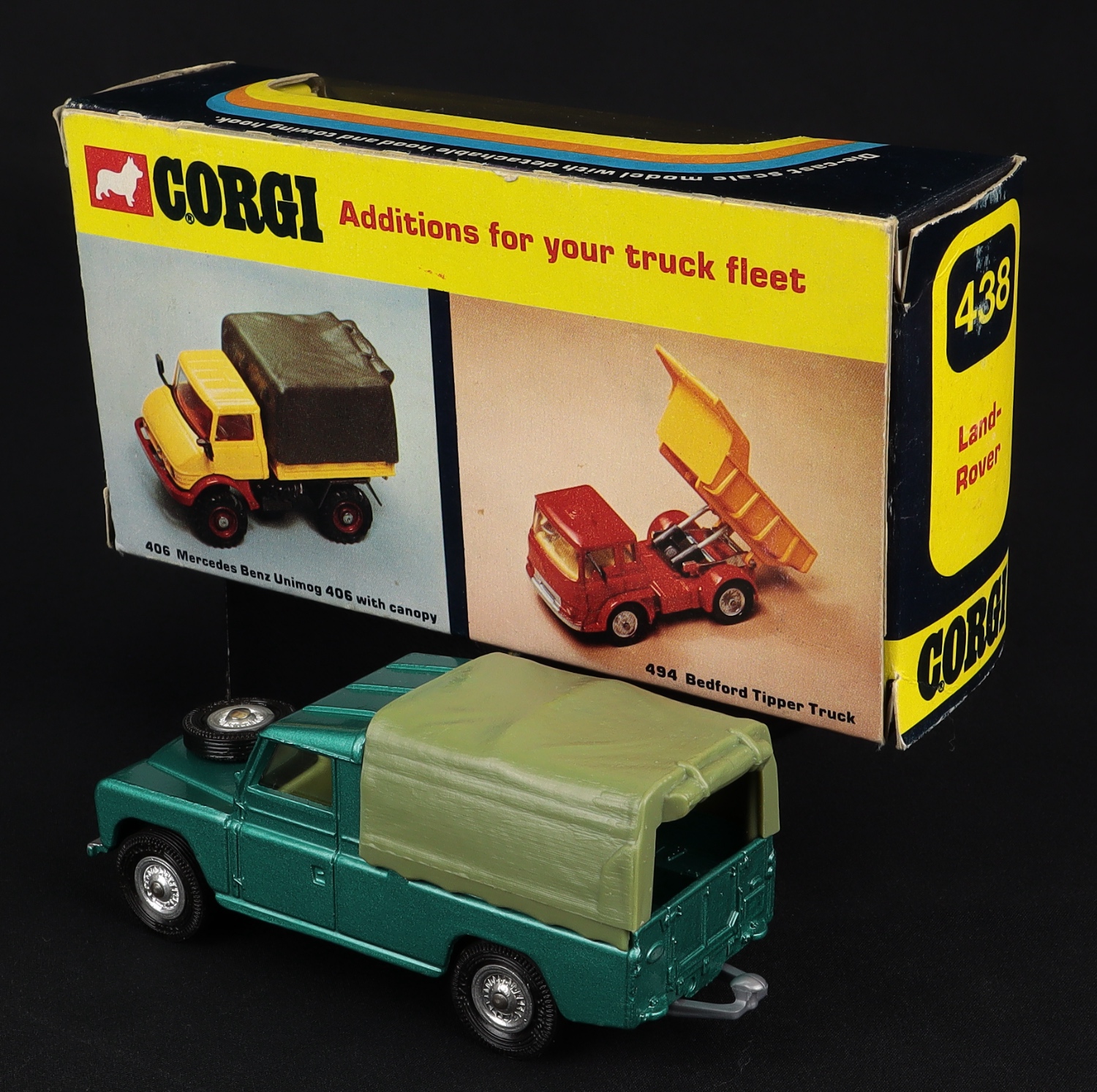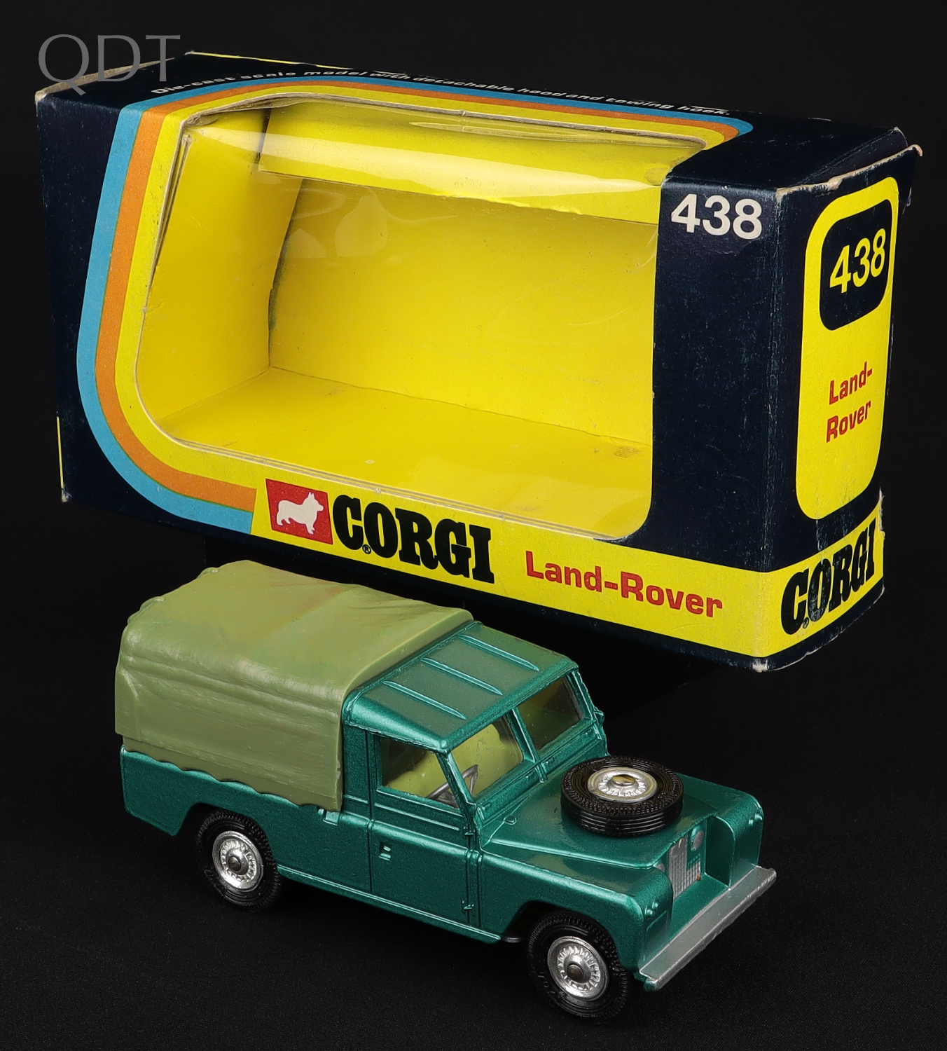 Landrover by Corgi Toys, No. 438. Very, very near mint/boxed. Metallic green with LIGHT OLIVE GREEN canopy. Cast wheels & late nylon tyres with Corgi Toys embossed. Very scarce SLIM RAINBOW window box with shaped yellow card inner with TOP OVERHANG. From 1973 only - and a First for QDT!