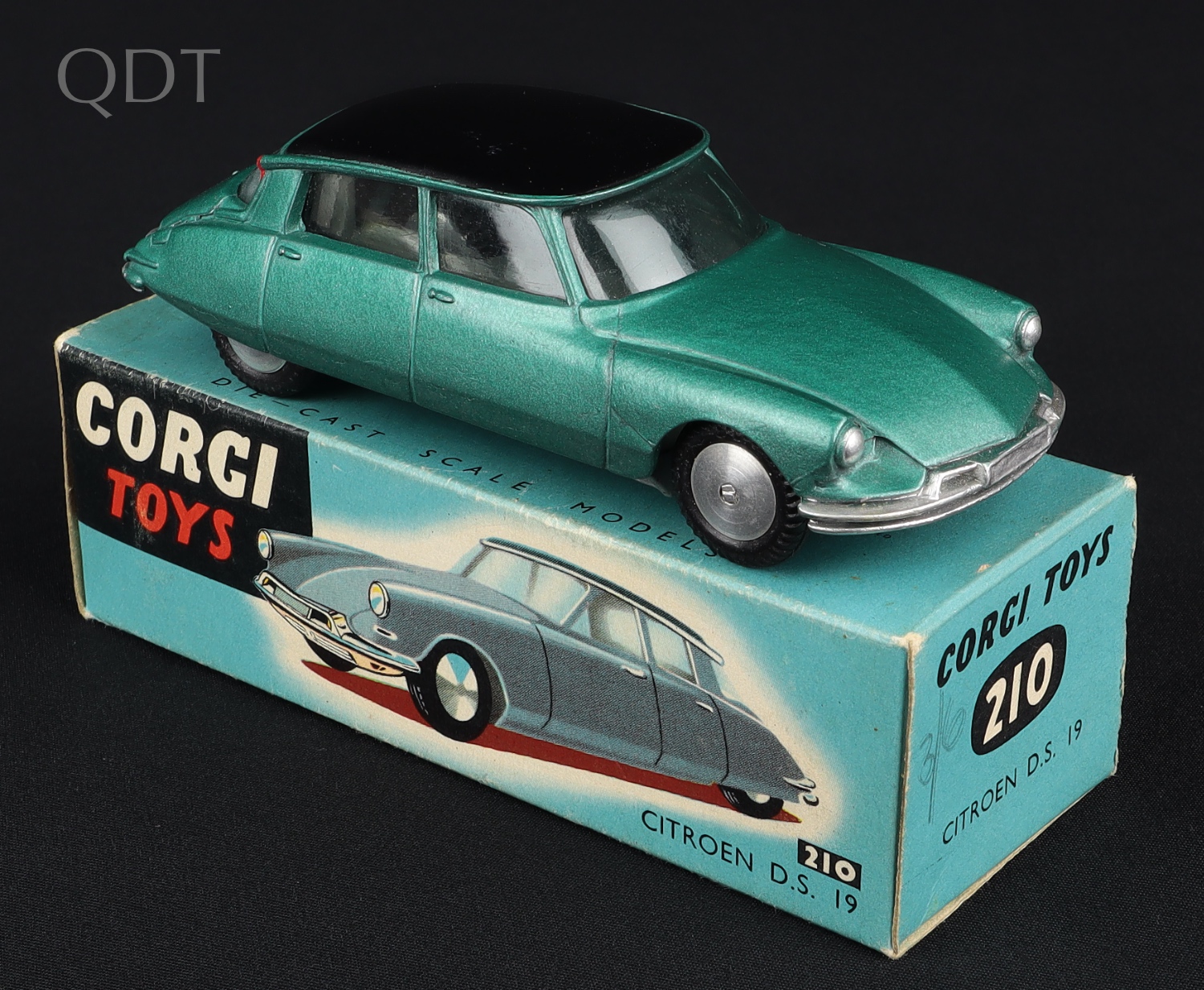 Citroen D.S. 19 by Corgi Toys, No. 210. Metallic green & black version - WITHOUT the mechanical 'bulge' on the base. Very near mint/boxed. From The Elmer Collection.