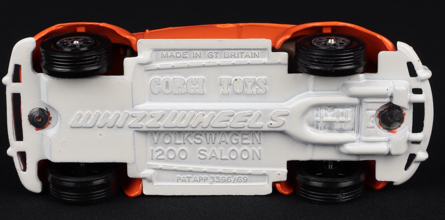Volkswagen 1200 by Corgi Toys, No. 383. A rare find in orange with an OLIVE interior with WHITE base & bumpers. Very near mint/boxed. With Whizzwheels. From The Bluehouse Collection.