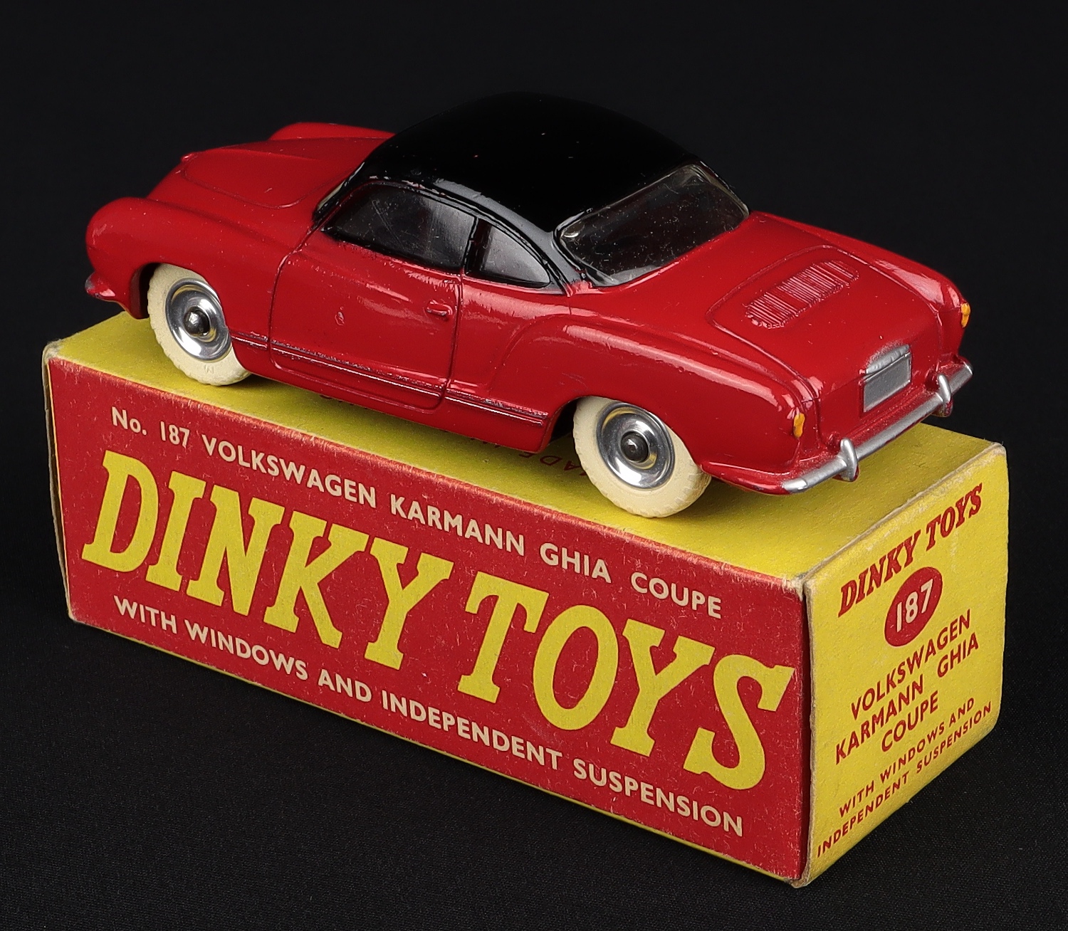 Volkswagen Karmann Ghia Coupe by Dinky Toys, No. 187. Red & black issue. Very near mint/boxed. From The Rickman Collection.