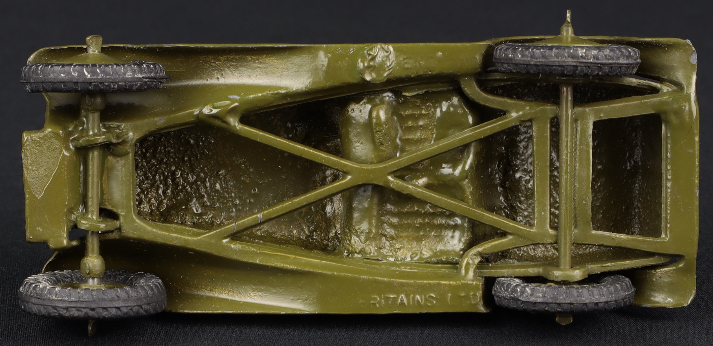A scarce issue with military green metal wheels and treaded black tyres with BRITAINS LTD emboss, silver radiator headlight assembly & windscreen frame. This Staff Car has a close to mint military olive-green finish and measures approx. 11cms x 4.5 cms.