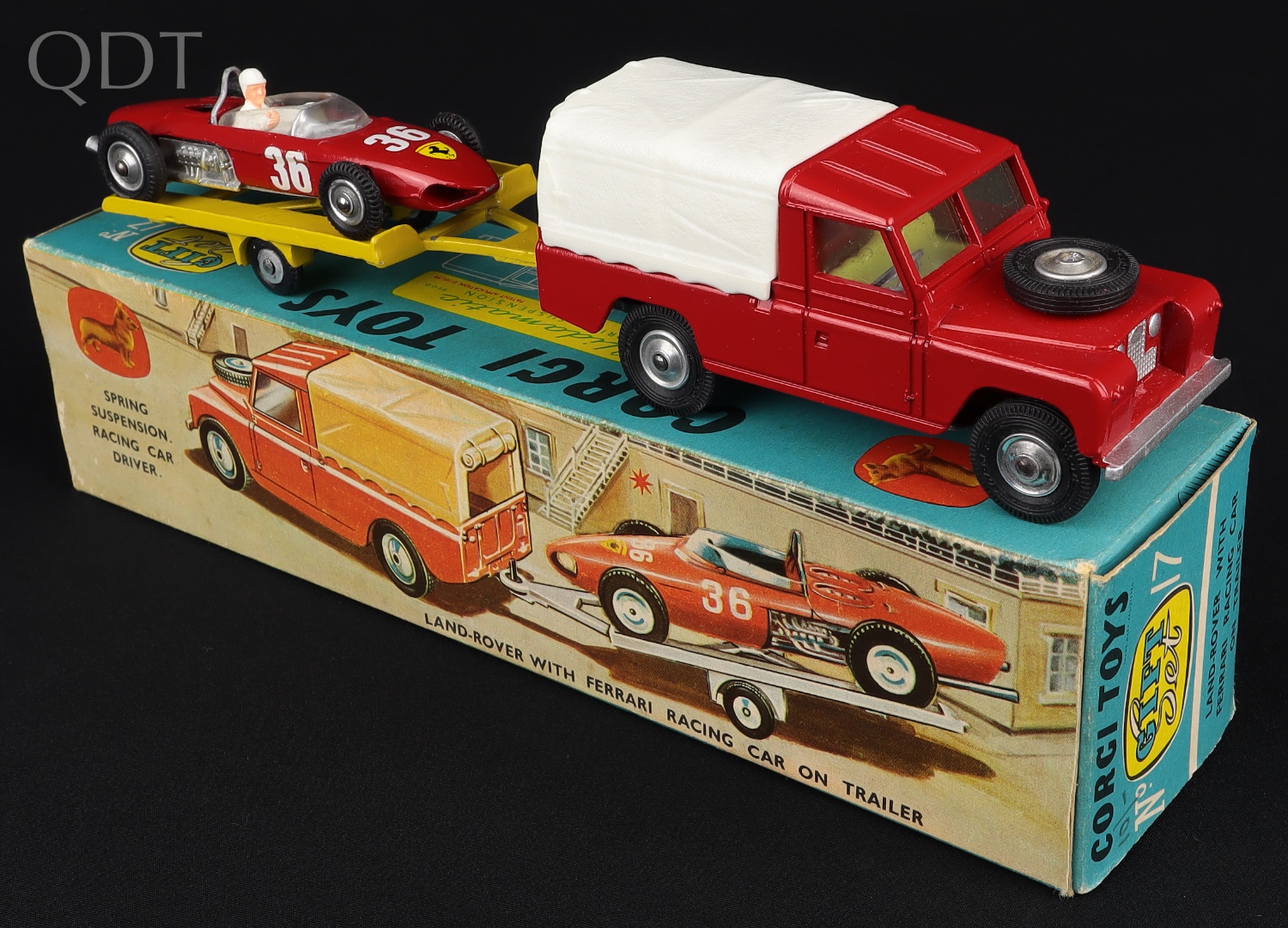 Land-Rover with Ferrari Racing Car on Trailer by Corgi Toys, Gift Set No. 17. Very scarce LAST issue with plastic tow hook, late issue nylon tyres & WHITE canopy. A First for QDT! Near mint plus - very near mint/boxed with plinth. From The Elmer Collection. Starting bid £250. Please note that QDT apply 12.5% buyer's commission.