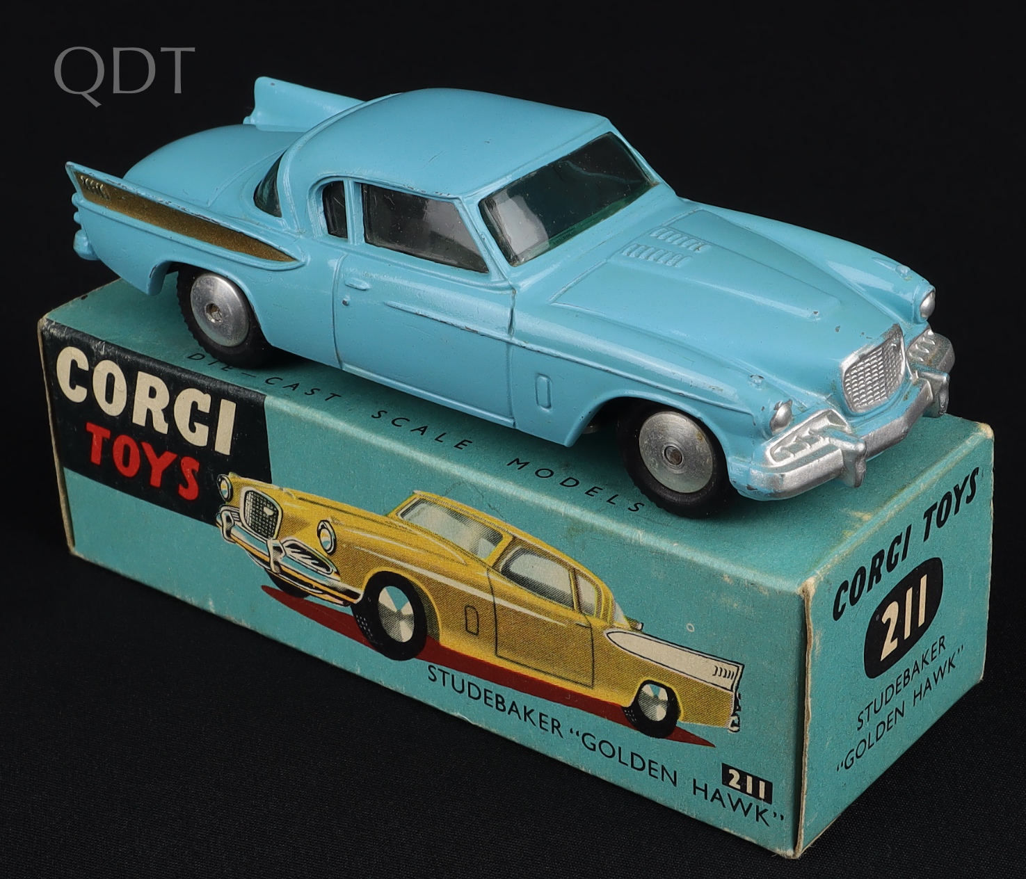 Studebaker Golden Hawk by Corgi Toys, N. 211. Near mint plus/boxed. Light blue with gold rear fins, flat spun wheels. From The Elmer Collection.