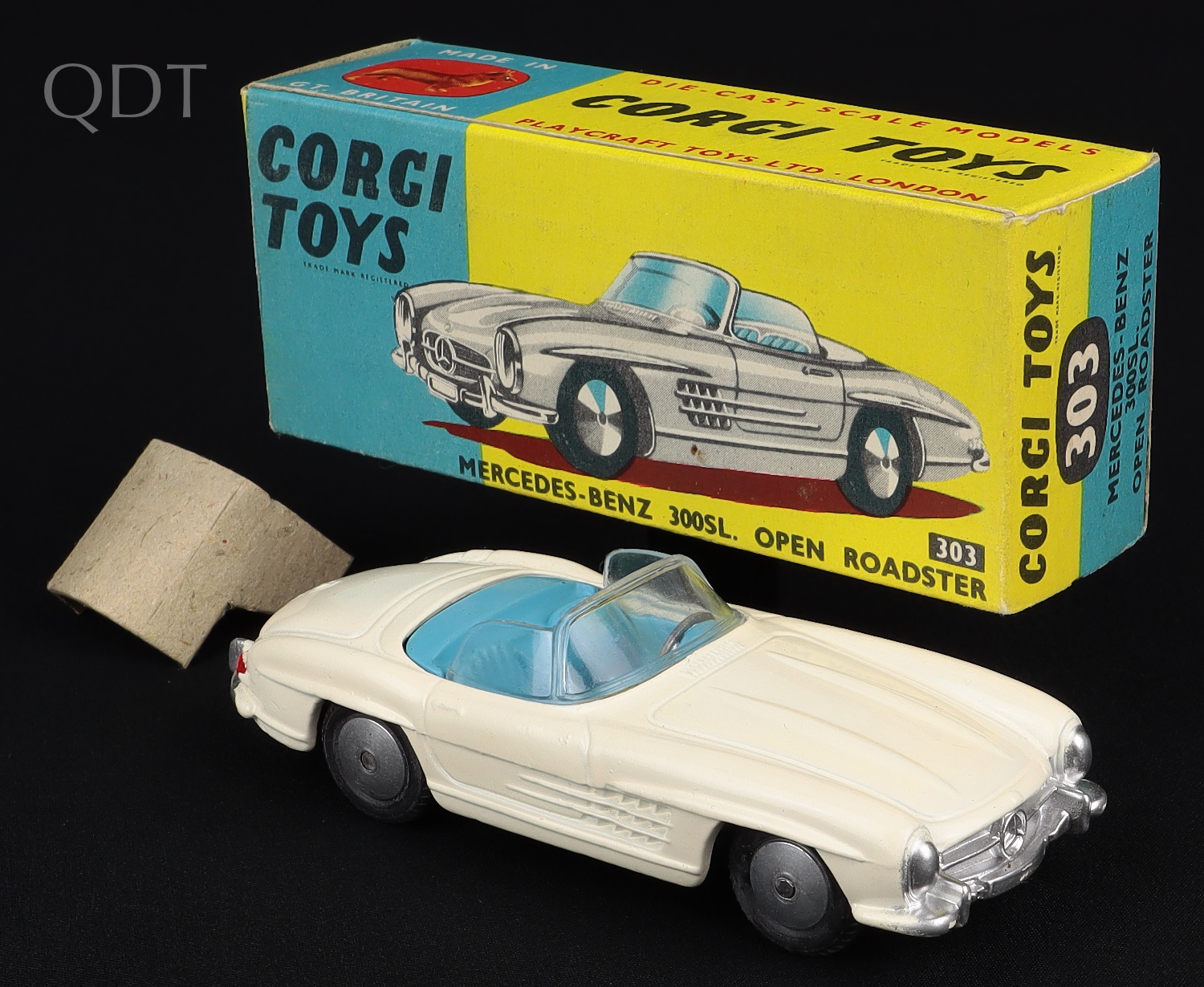 Mercedes 300SL Open Roadster by Corgi Toys, No. 303. White with CLEAR SCREENS & flat spun wheels. Very near mint/boxed, with card packing piece.
