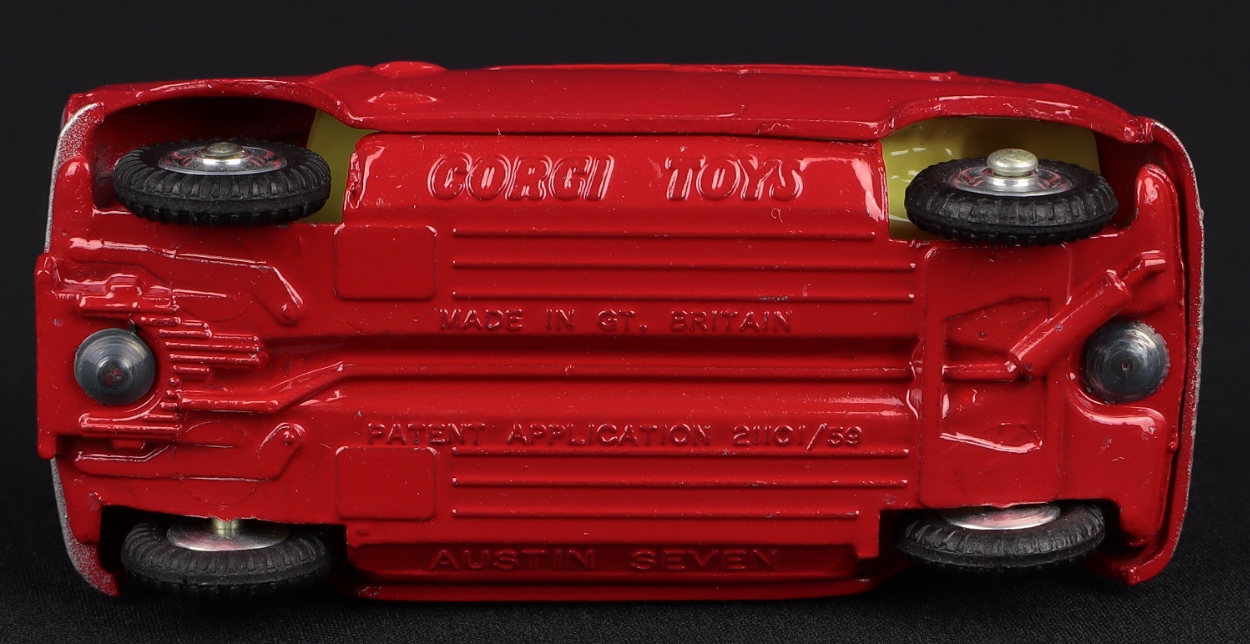 Austin Seven Saloon by Corgi Toys, No. 225. Vivid red issue. SHAPED SPUN WHEEL issue & early base with Patent Application. Very, very near mint/boxed.