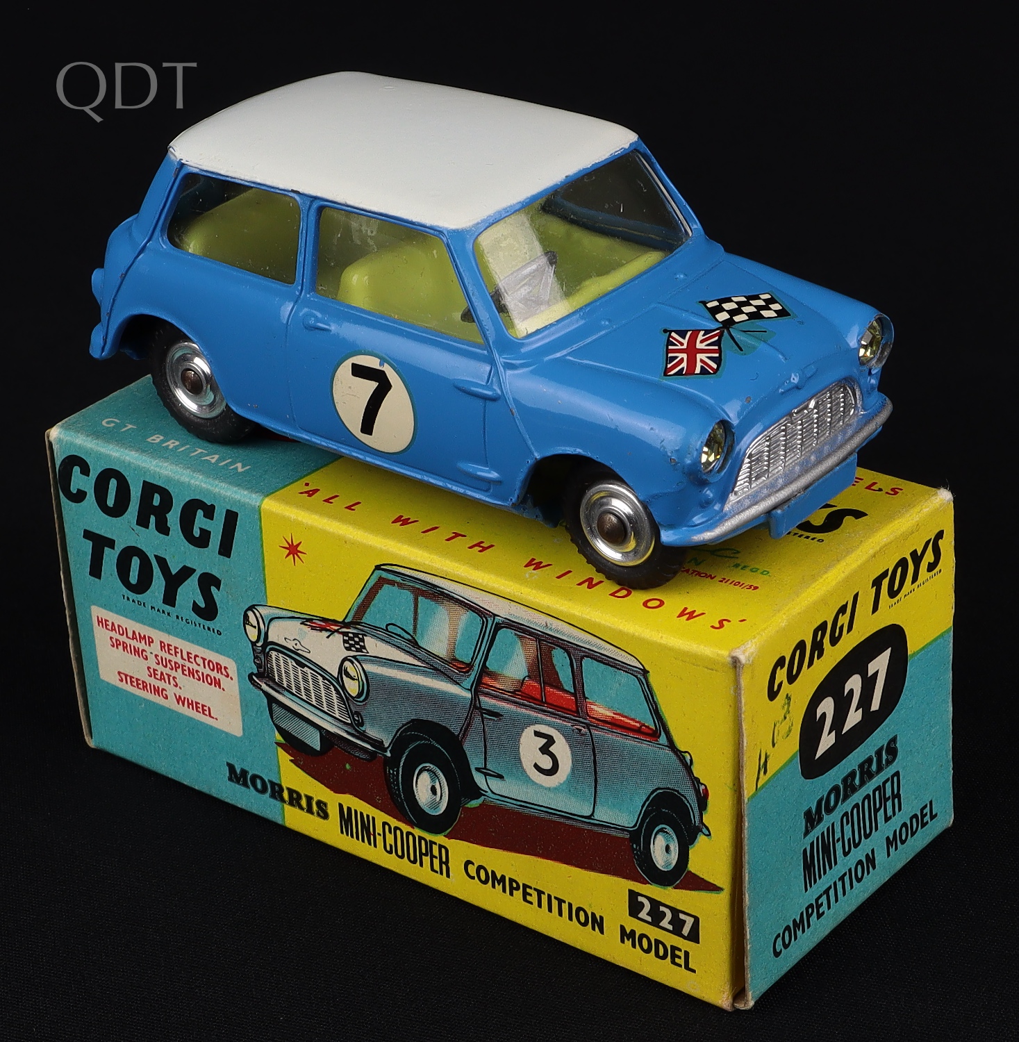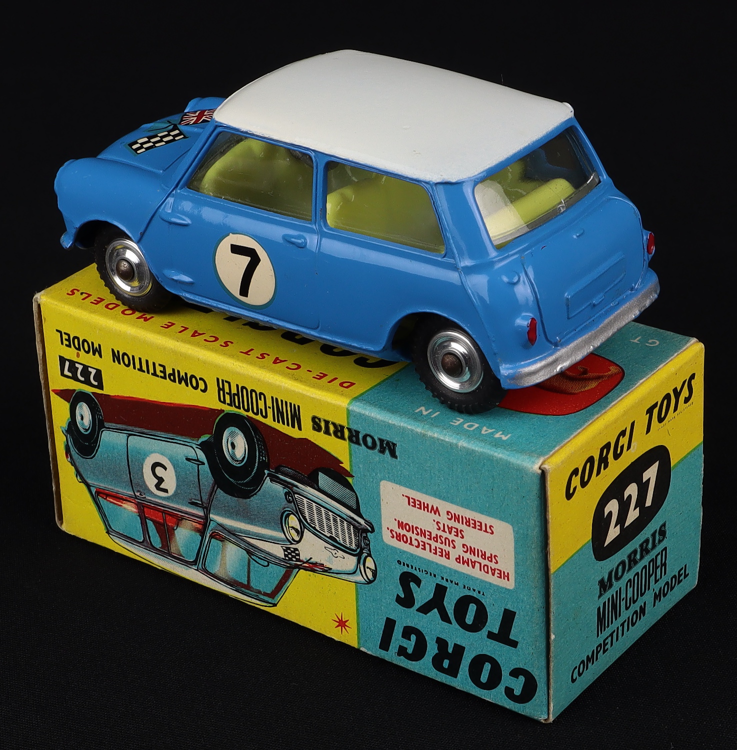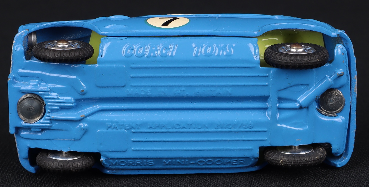 Morris Mini-Cooper Competition Model by Corgi Toys, No. 227. Very near mint/boxed. Scarce issue in blue with a WHITE ROOF ONLY, blue bonnet. Bold racing number 7 version.