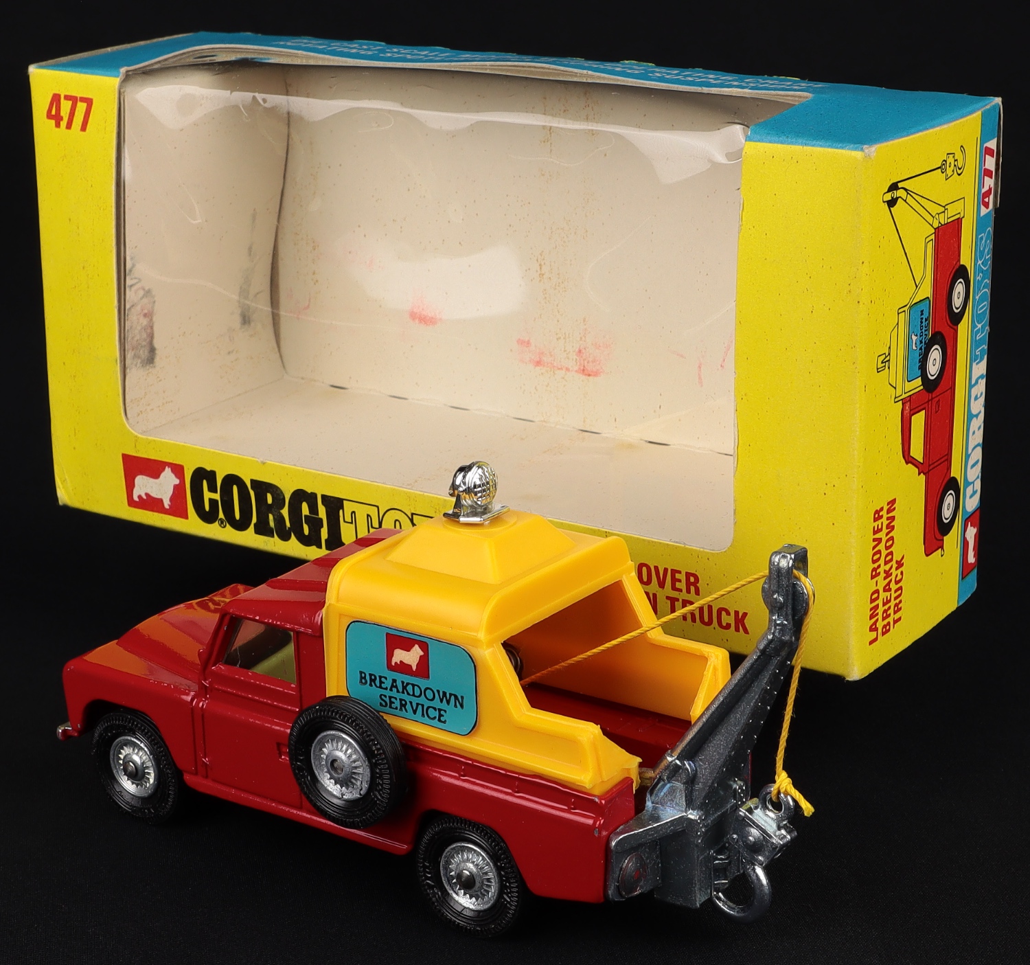 Land-Rover Breakdown Truck by Corgi Toys, No. 477. Cast wheels issue. Very, very near mint/boxed. Scarce in the BLUE & YELLOW WINDOW box.