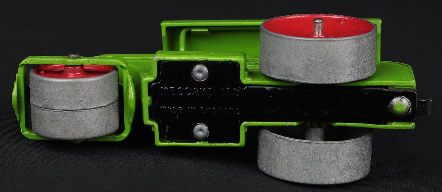 A particularly difficult find in this distinctive shade of lime green. Usually found in bright mid-green. Fine lustrous sheen to this classic Dinky model. Red rollers, familiar fawn driver. Later issue so note that this model does not have the red paint detail at the front.