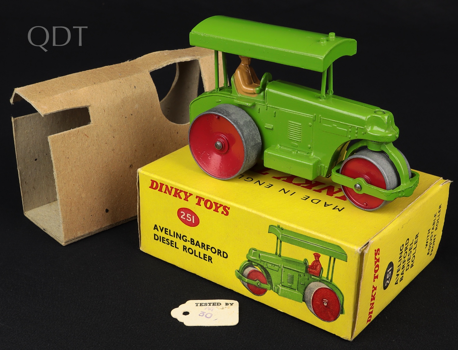 Aveling-Barford Diesel Roller by Dinky Toys, No. 251. Very near mint/boxed. Rare find in LIME GREEN. Very scarce! With card packing & Dinky Quality Control Tag! In harder to find 'HORIZONTAL' PICTURE BOX. From The Reference Collection. Starting bid £200. Please note that QDT apply 12.5% buyer's commission.