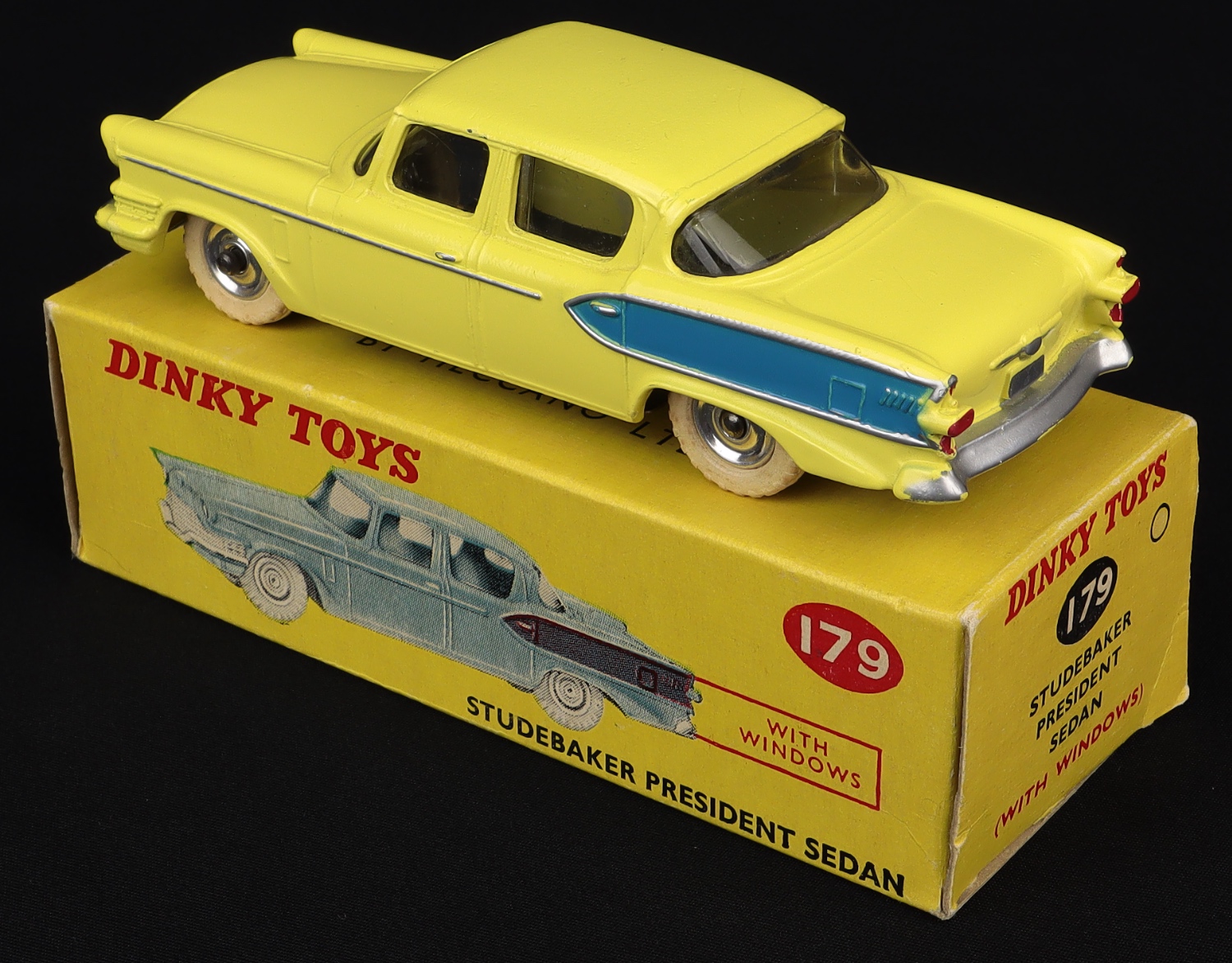 Studebaker President Sedan by Dinky Toys, No. 179. Very near mint/boxed. Yellow & blue issue. Spun wheels. Scarce. From The Rickman Collection.