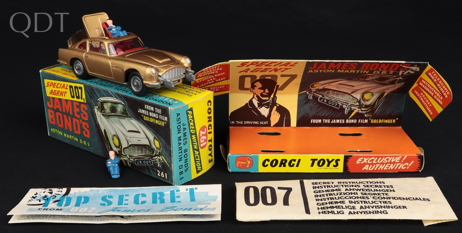 James Bond's Aston Martin D.B.5 by Corgi Toys, No. 261. Gold issue. Very near mint/boxed. 1st issue WITH INDICATOR LIGHT CASTING. 1st issue style box with Secret Instruction Packet (with Instructions & villain only). From The Richmond Collection.