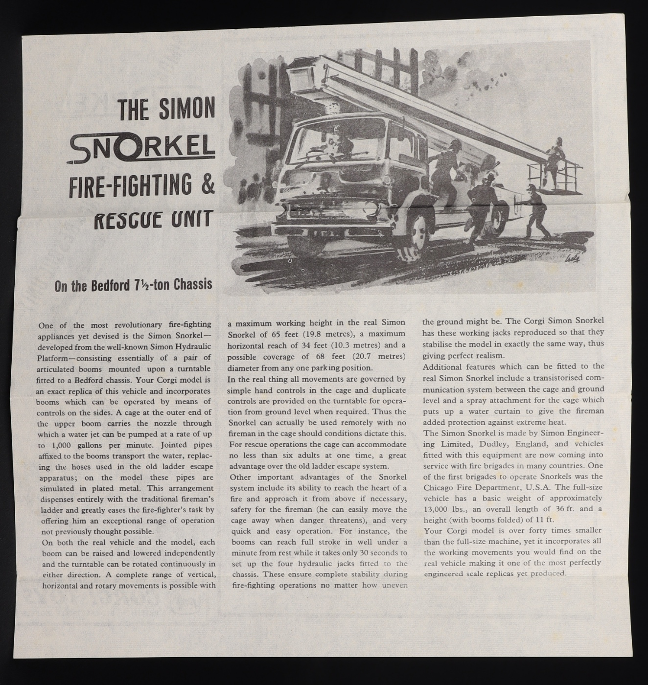 A popular Corgi model from the Major Packs Emergency Vehicle range of toys. The Simon Snorkel fire engine was made between 1964-74, with a Bedford cab, 6 firemen, water cannon, extending and rotating boom. This model presents very nicely with bright supports for the boom and a vivid lustre to the original paint finish.