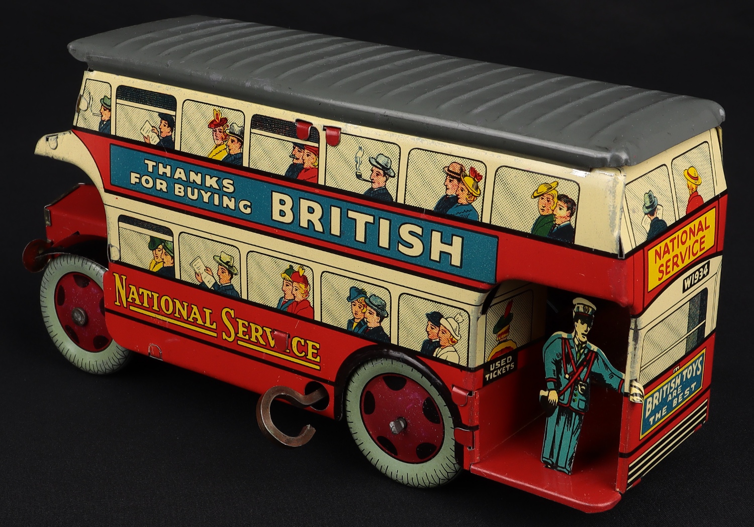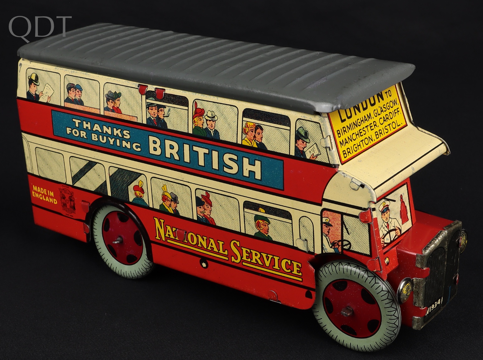 ‘NATIONAL SERVICE’ & ‘THANKS FOR BUYING BRITISH’ at the sides. One piece tinplate ‘balloon-style’ wheels are grey & maroon. "BRITISH TOYS ARE THE BEST’ at the rear.