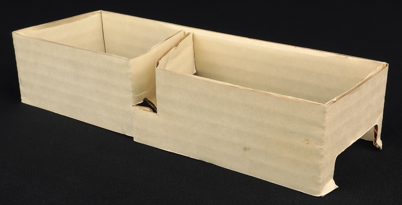 Both pull-out tabs are present and tear-free. Remains of old sellotape on the underside. Original elastic band still in situ which keeps the trailer in place too.