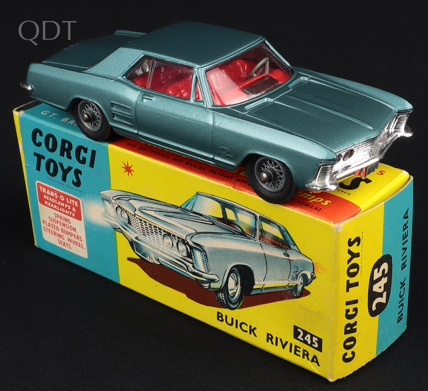 Buick Riviera by Corgi Toys, No. 245. Scarce metallic GREEN-BLUE issue with SPOKED WHEELS. Very near mint/boxed. From The Berlin Collection. Starting bid £200. Please note that QDT apply 12.5% buyer's commission.