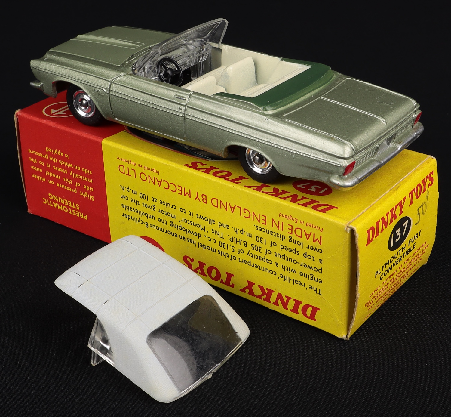 Plymouth Fury Convertible by Dinky Toys, No. 137. Greenish-silver finish with pale grey hard top. Very near mint/boxed, with packing ring. Scarce. From The Reference Collection.