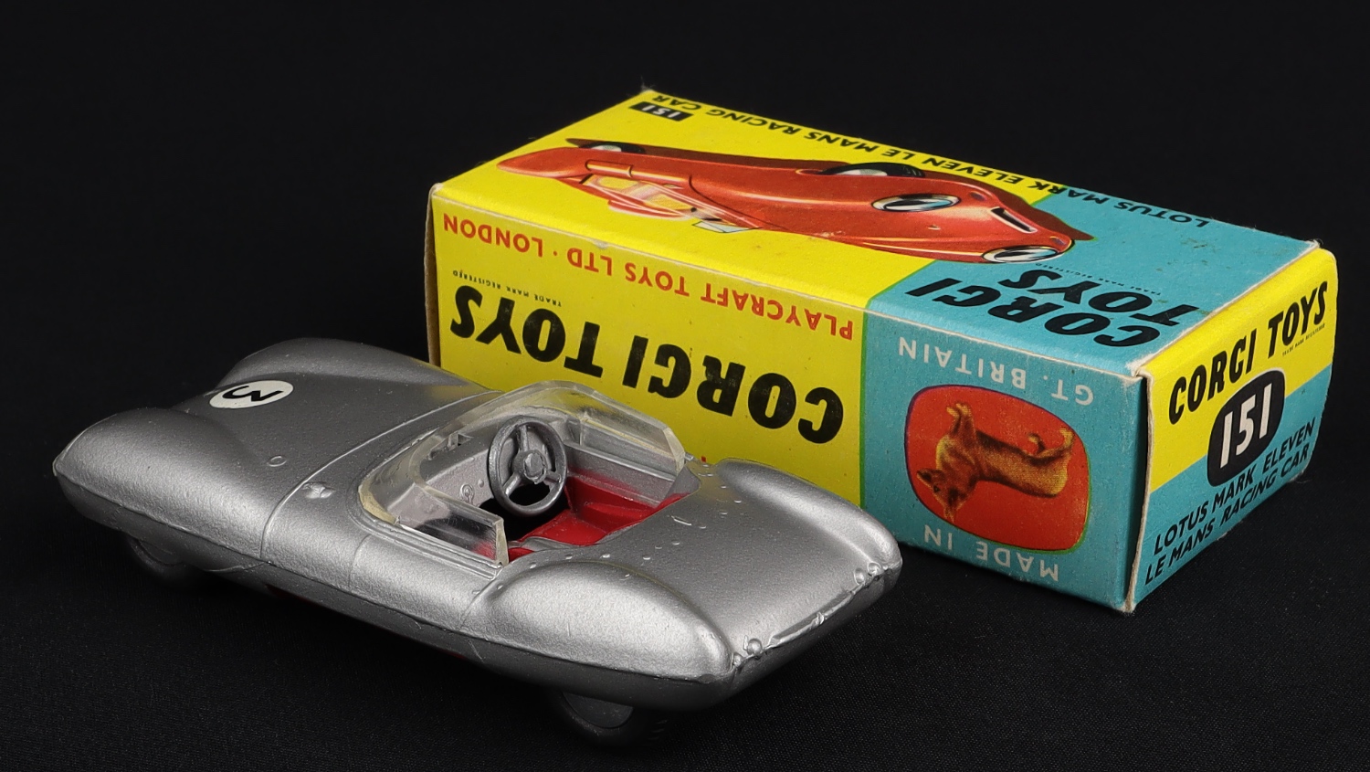 Lotus Mark XI Le Mans Racing Car by Corgi Toys, No. 151. Silver, Racing Number 3, with clear screens. Mint/boxed. High quality from The Rickman Collection. Starting bid £125. Please note that QDT apply 12.5% buyer's commission.