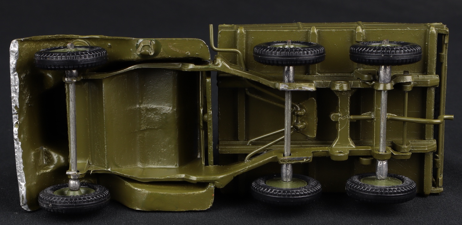 Finished in olive green with silver trim and tilting back. Matching plastic wheels and well-shaped original fine tread tyres with ‘BRITAINS LTD ENGLAND’ embossed. Round nosed cab with silver trim. With driver in uniform.