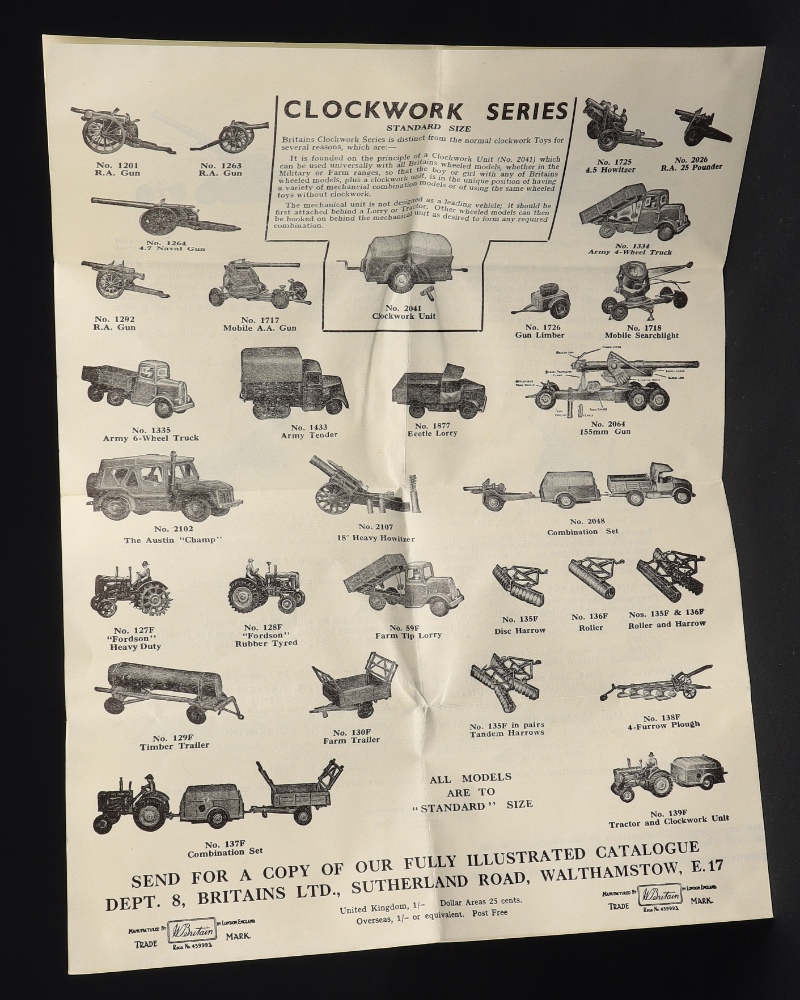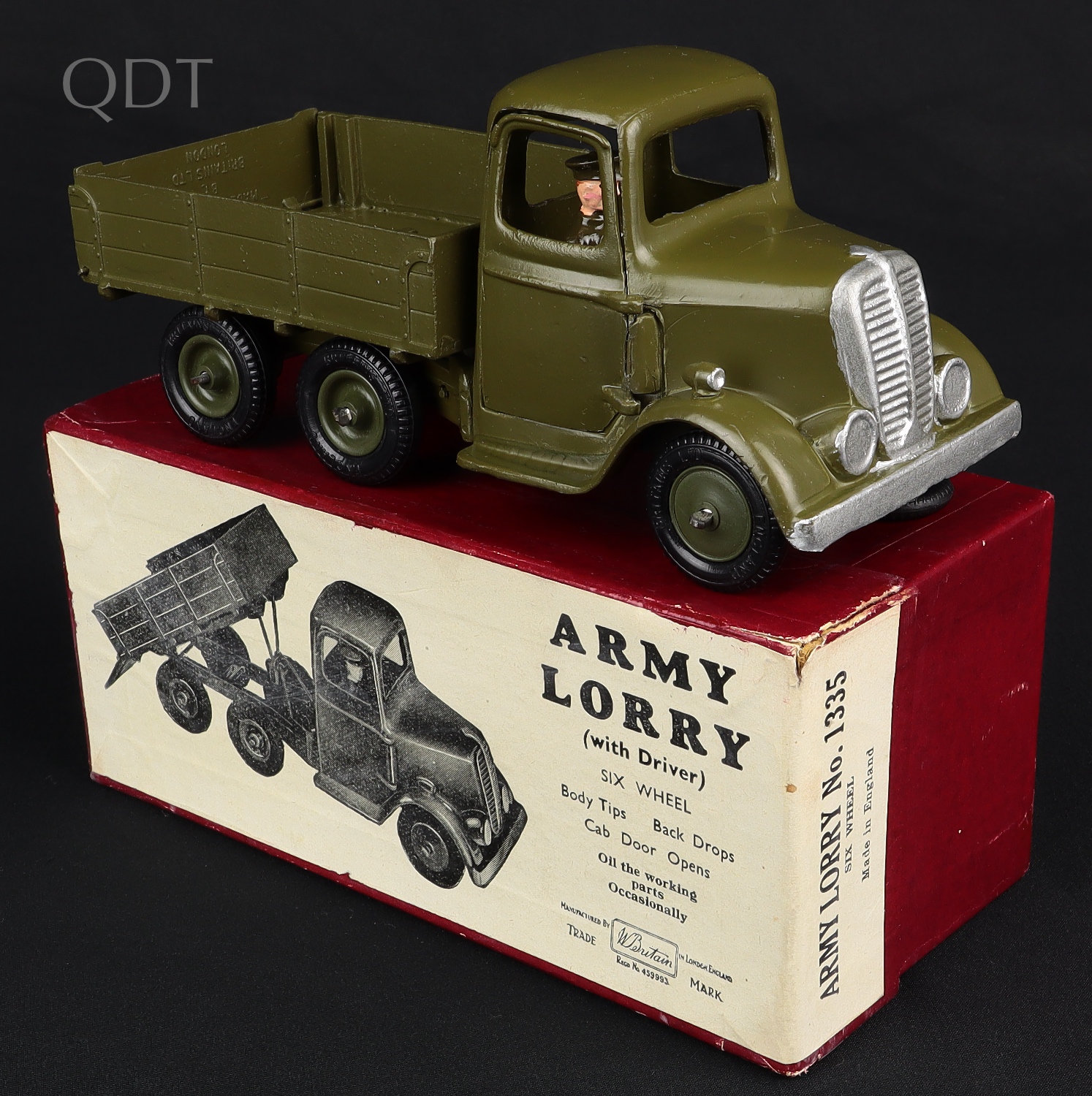 Six Wheel Army Lorry by Britains Models, No. 1335. With driver. Very very near mint/boxed, with promotional leaflet. Another scarce model from The Denis Tyler Collection. Starting bid £75. Please note that QDT apply 12.5% buyer's commission.