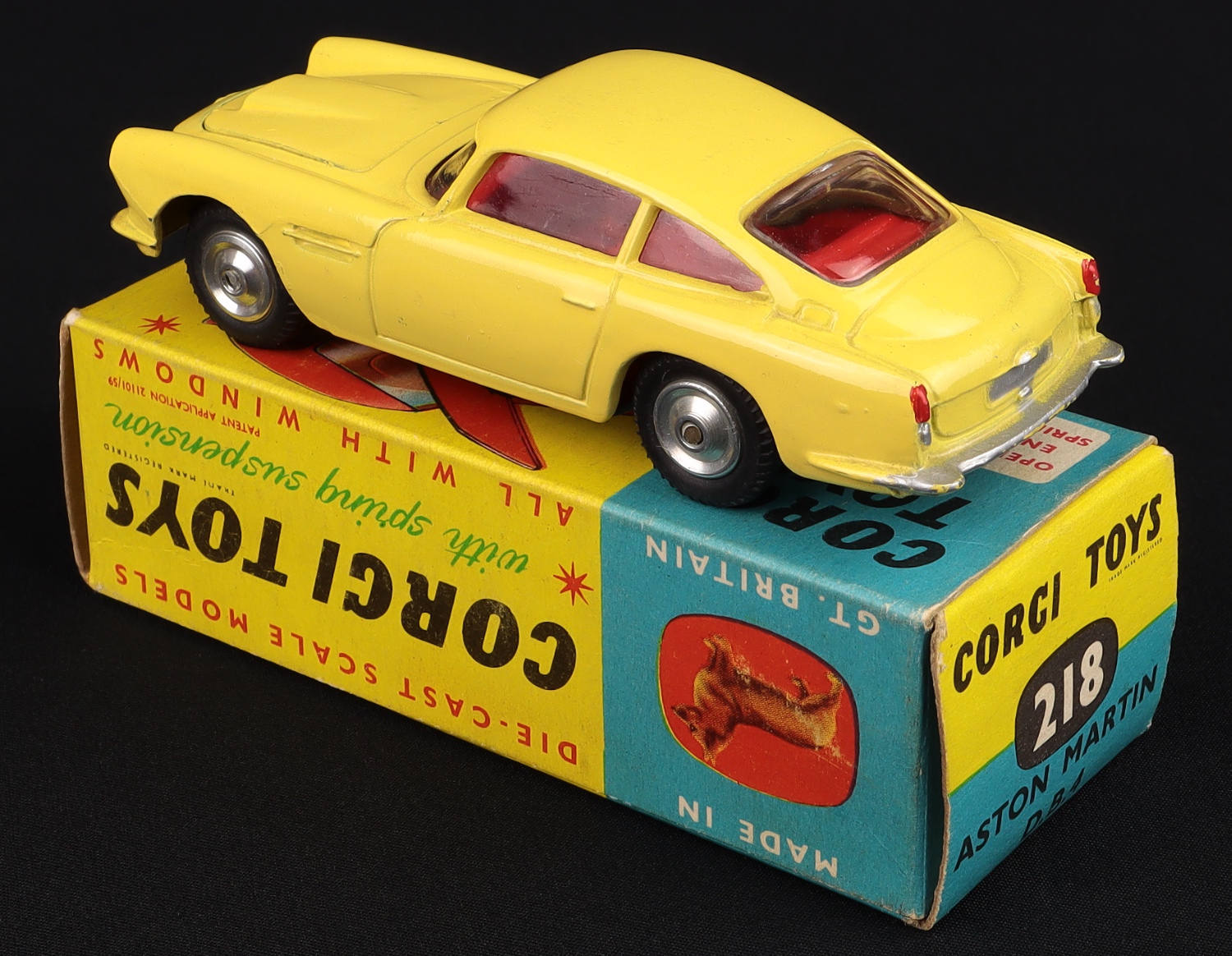 Aston Martin D.B.4 by Corgi Toys, No. 218. Very near mint/boxed. Yellow version with SHAPED spun wheels & OPEN bonnet vent. Such a rare find! From The Berlin Collection.