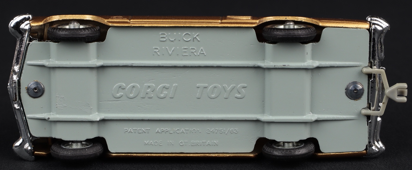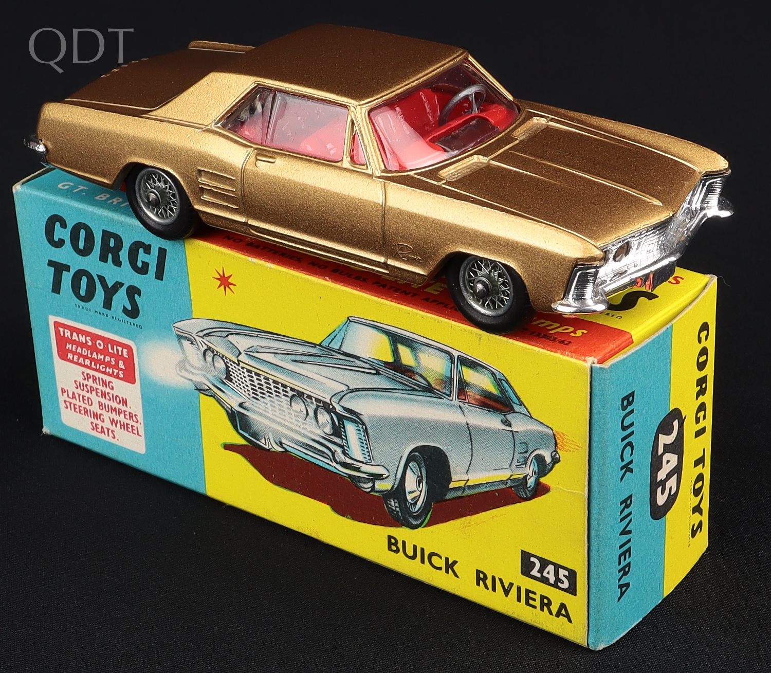 Buick Riviera by Corgi Toys, No. 245. Gold issue, spoked wheels. Very near mint/boxed. From The Rickman Collection.