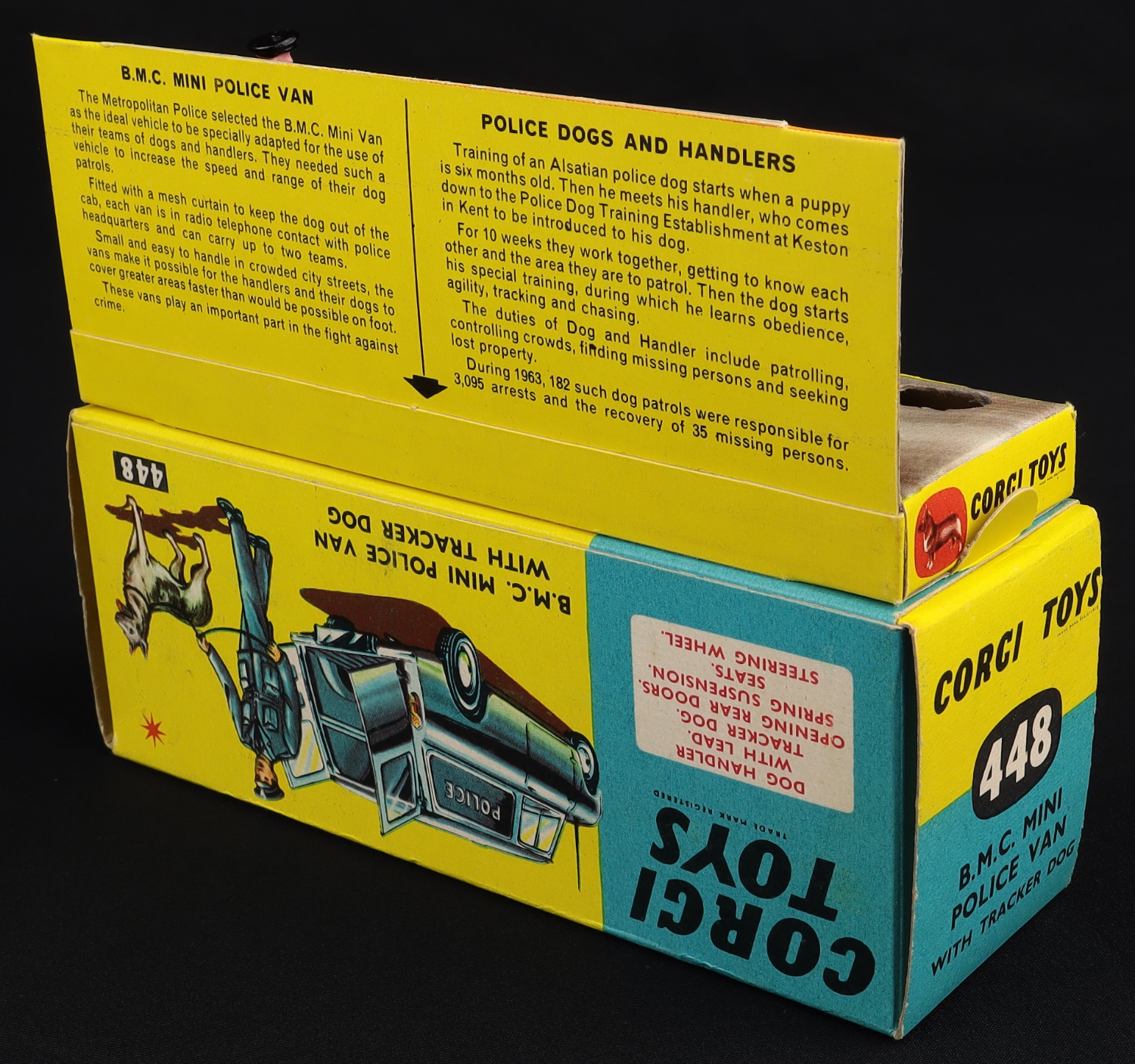 B.M.C. Mini Police Van With Tracker Dog by Corgi Toys, No. 448. Spun wheels & COUNTRYMAN BASE. Rare - and a First for QDT! Very near mint/boxed. From The Rickman Collection. QDT starting bid £175. Please note that QDT apply 12.5% buyer's commission.