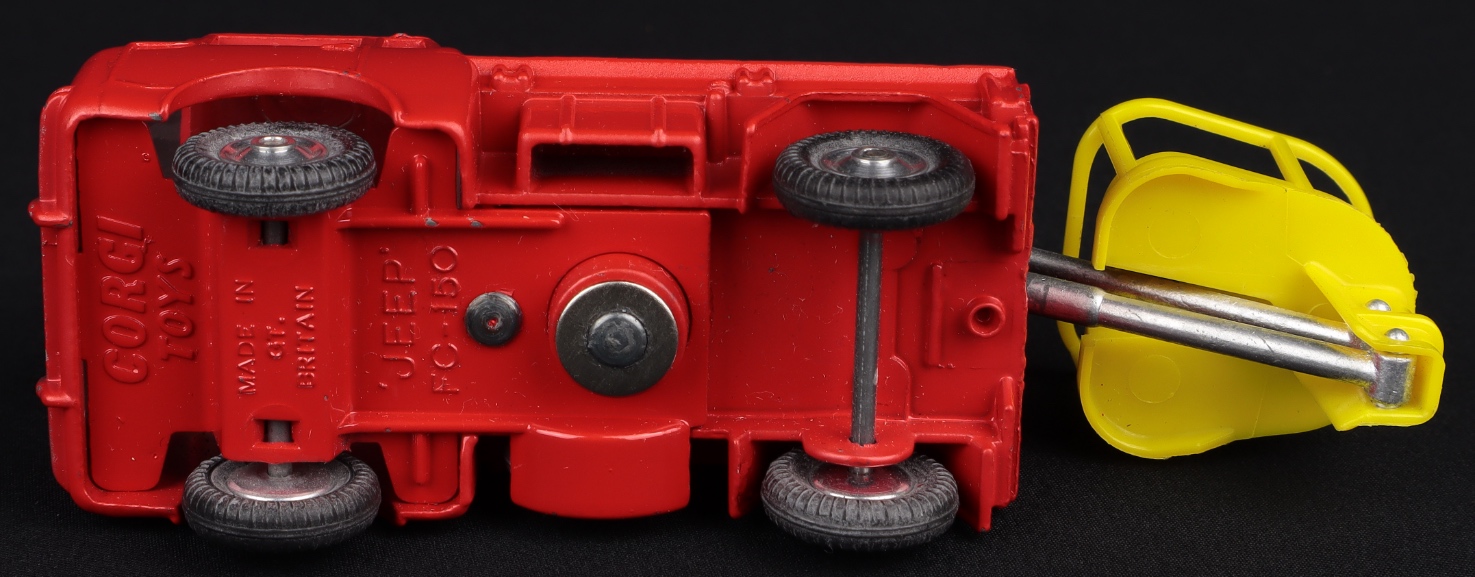 Issued between 1961-64, this Gift Set comprises a 409 Jeep in vibrant red, with shaped spun wheels and as-new original tyres. Yellow hydraulic basket elevates and rotates. Comes complete with plastic figure and lamp post.