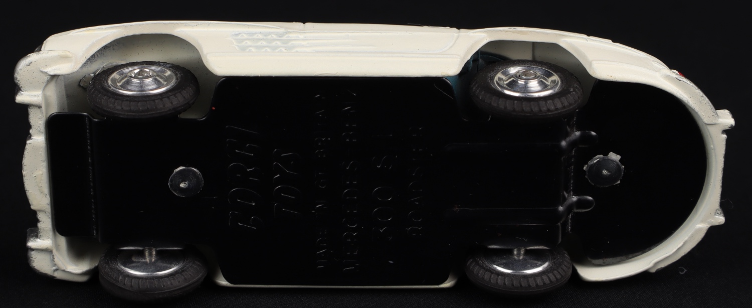 Mercedes-Benz 300Sl Roadster by Corgi Toys, No. 303. Scarce white issue with SHAPED spun wheels. & clear screens. Very near mint/boxed. FromThe Rickman Collection.
