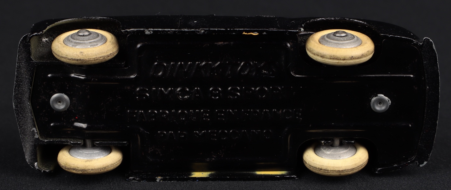Simca 8 Sport by French Dinky Toys, No. 24S. 1st type. Gloss black, TAN seating. Shiny SILVER-BLUE wheels. Very scarce! Near mint/not individually boxed. From The Dutch-Hillman Collection. Starting bid £200. Please note that QDT apply 12.5% buyer's commission.