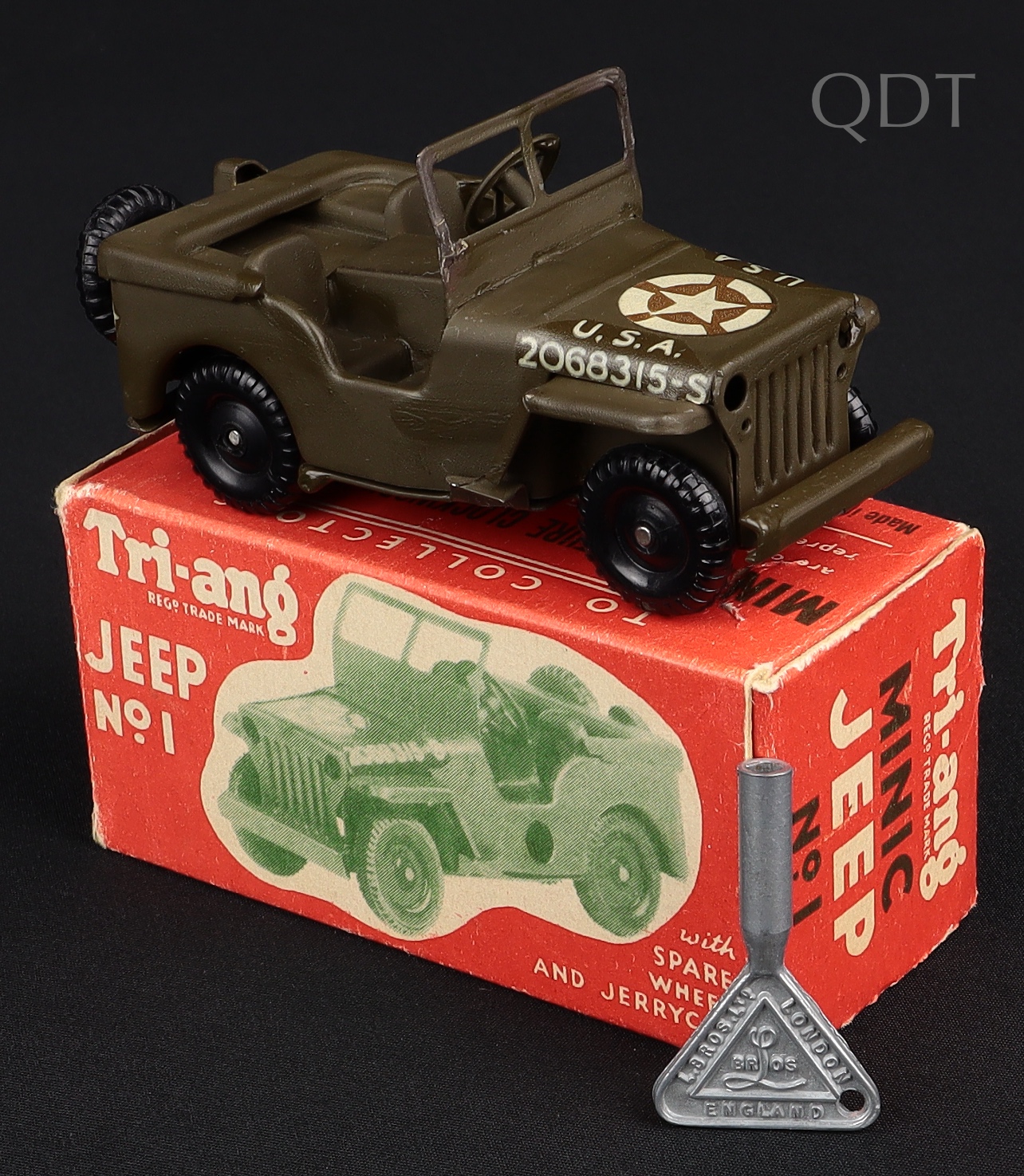 Tri-ang Minic No. 2 Jeep. Clockwork, with spare wheel and Jerry Can. Original Minic Key. Near mint plus/boxed. Working clockwork motor. From The Denis Tyler Collection. Starting bid £75. Please note that QDT apply 12.5% buyer's commission.