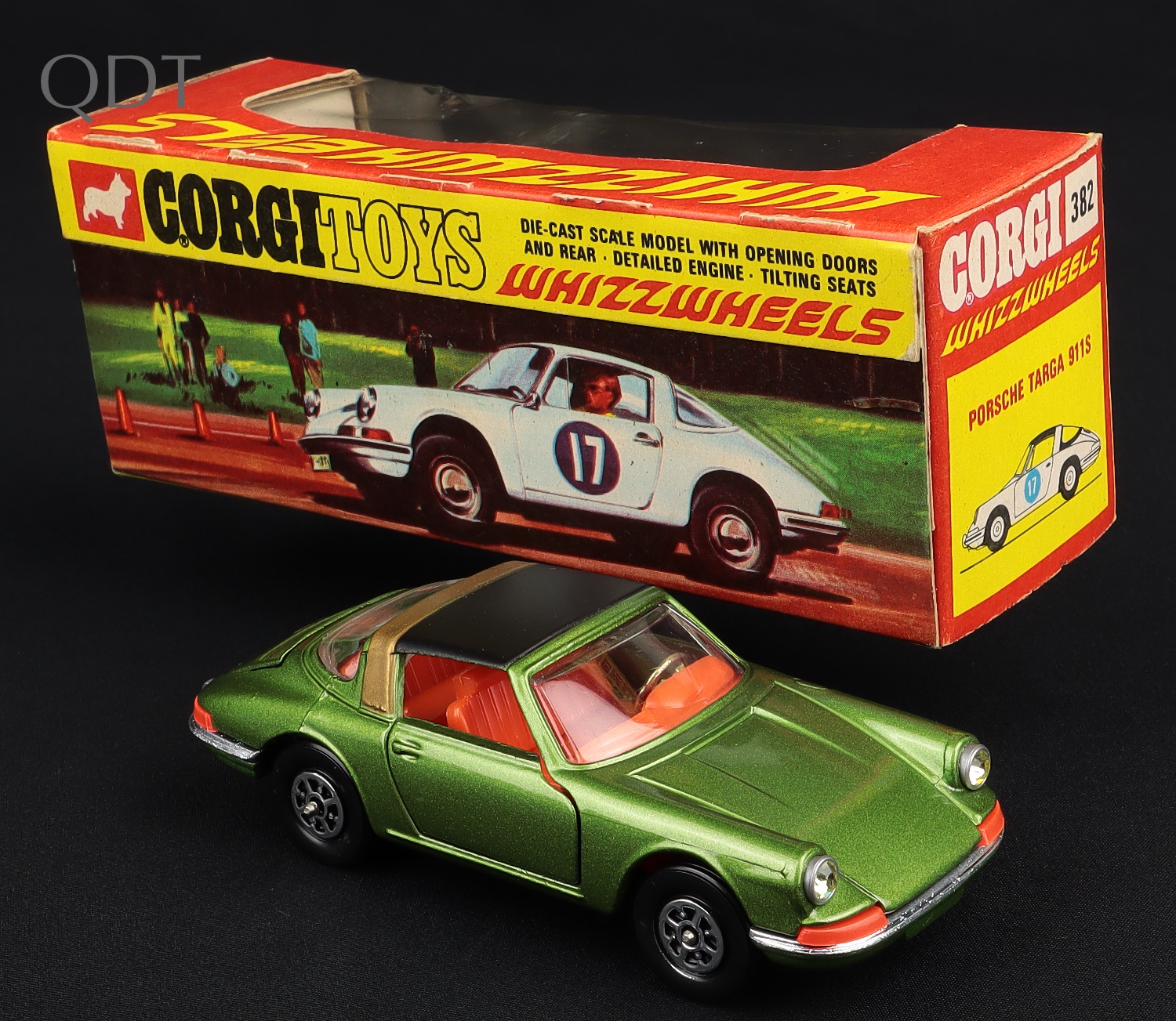 Porsche Targa 911S by Corgi Toys, No. 382. Very near mint/boxed. Metallic green, orange interior. A more difficult find in the early RED & YELLOW WINDOW BOX. From The Elmer Collection.