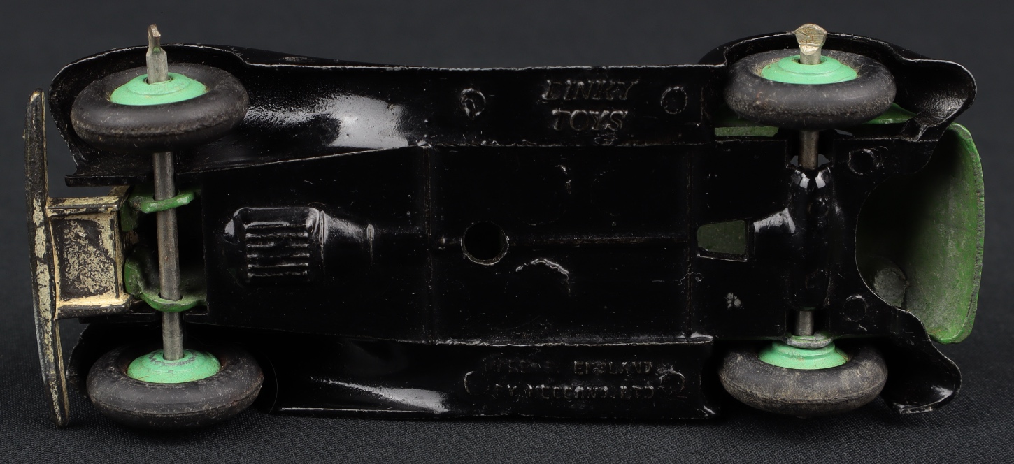 This classic model is a scarce export version in distinctive mid-green with black wings, light green ridged wheels and closed detailed chassis. Intact and complete radiator (much of the plating remains), headlight and bumper assembly.