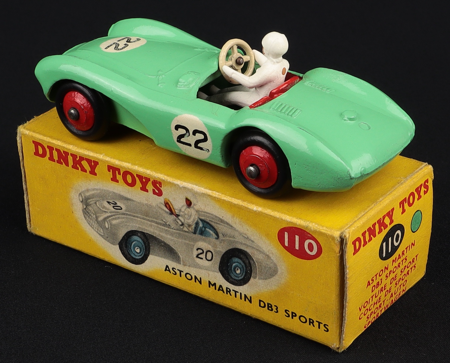 Aston Martin DB3 Sports by Dinky Toys, No. 110. Rare LIGHT GREEN issue. Very near mint/boxed. From The Off-Shore Collection.