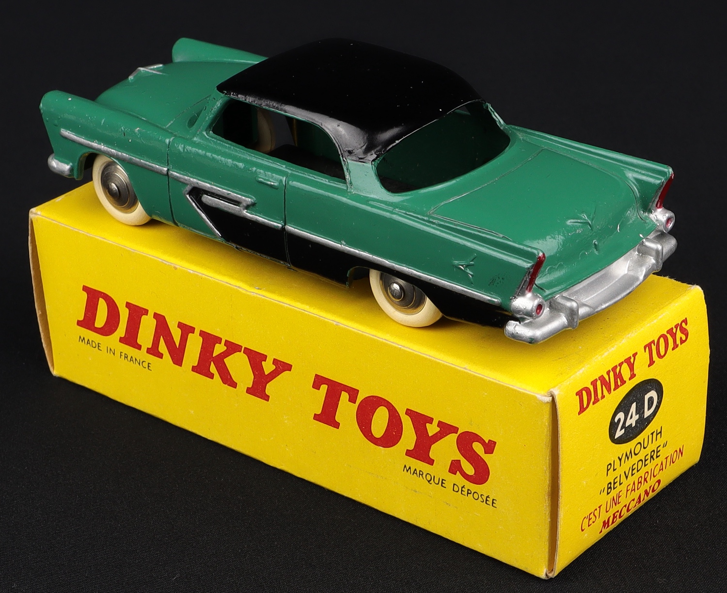 Plymouth "Belvedere" by French Dinky Toys, No. 24D. Very near mint /(plain) boxed. Deep green and black, convex wheels, early issue. From The Dutch-Hillman Collection. QDT starting bid £150. Please note that QDT apply 12.5% buyer's commission