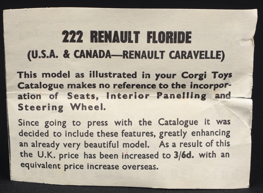 Renault Floride by Corgi Toys, No. 222. Metallic blue with RED interior. Scarce. Very near mint/boxed, with model specific leaflet. Shaped spun wheels issue. From The Eccles Collection.