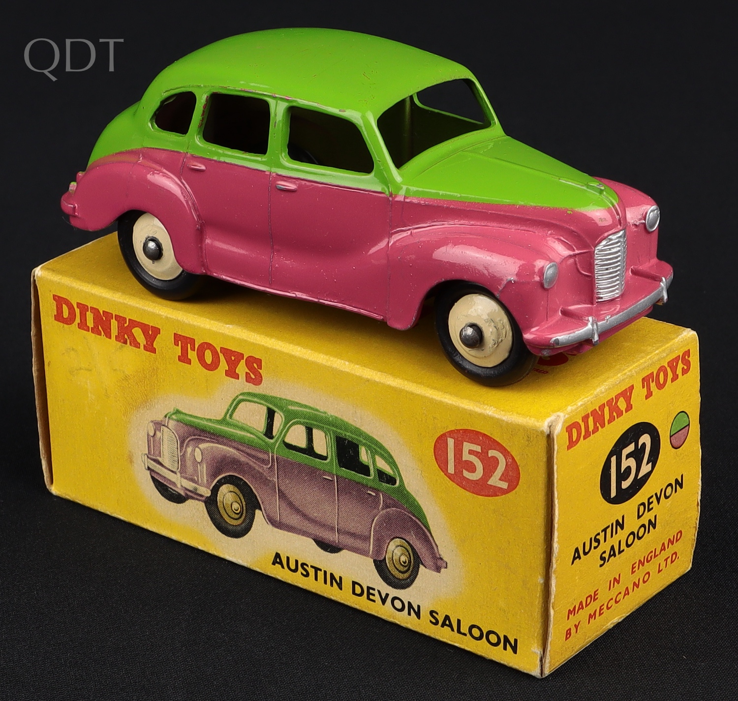 Austin Devon Saloon by Dinky Toys, No. 152. Scarce issue in cerise and green. Very near mint/boxed. From The Dutch-Hillman Collection.