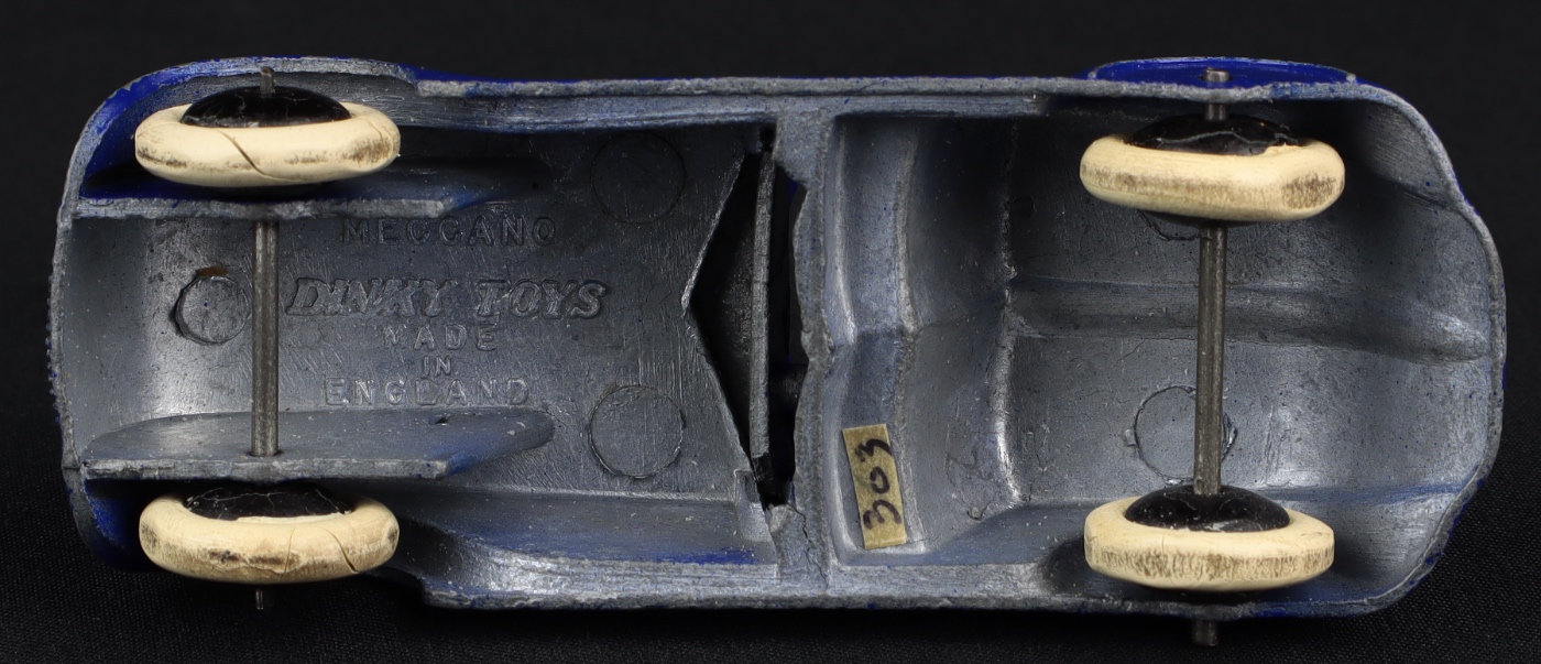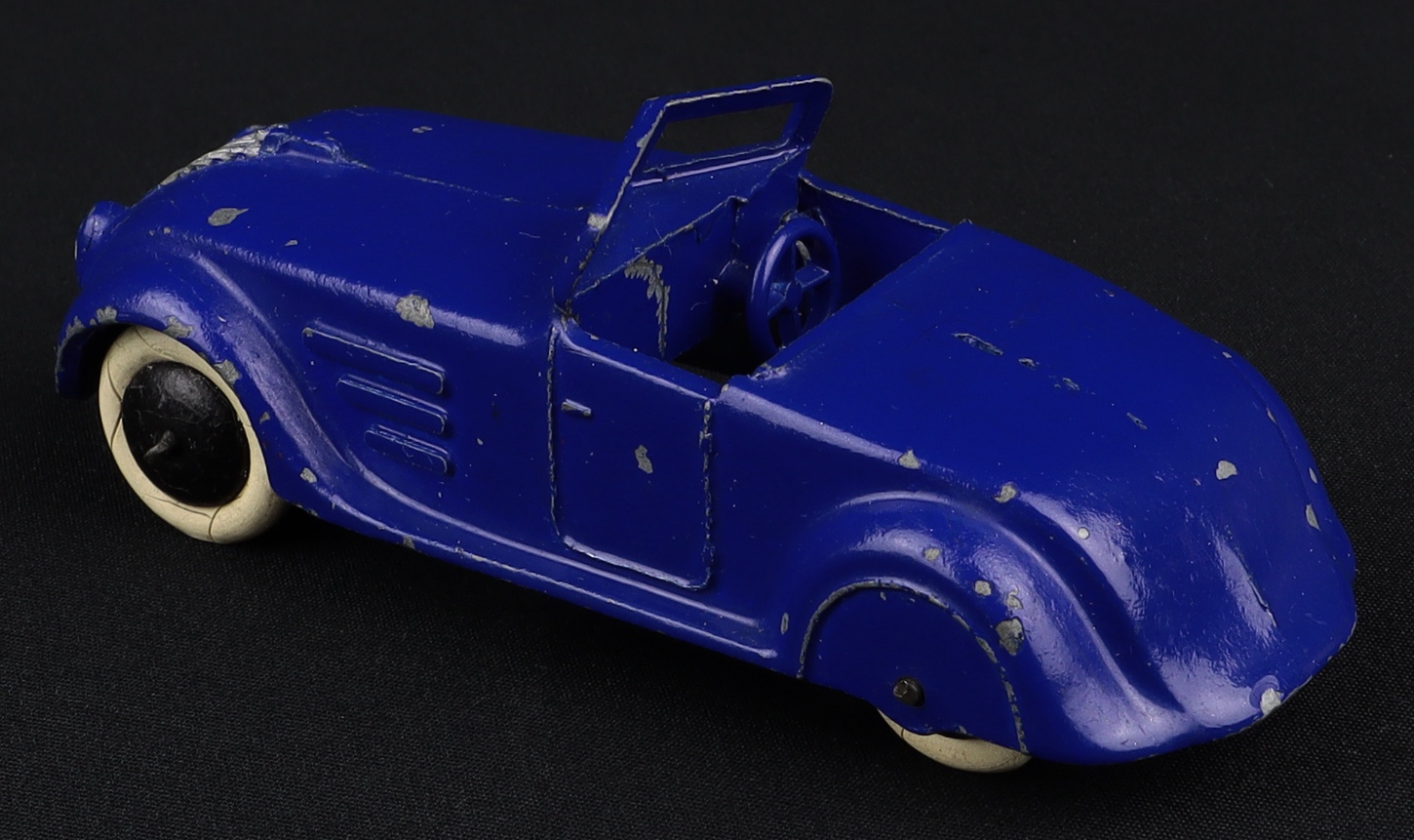 What a delightful Pre-War Dinky survivor! This early Dinky car(1935-41) in all original condition has an intense cobalt blue finish, with the distinctive radiator picked out in silver. Complete with both the cast windscreen and steering wheel intact. Black smooth wheels are notably sound and the correct white tyres are all present, with inevitable (light) wear to some. Occasional little chip to the paint finish.