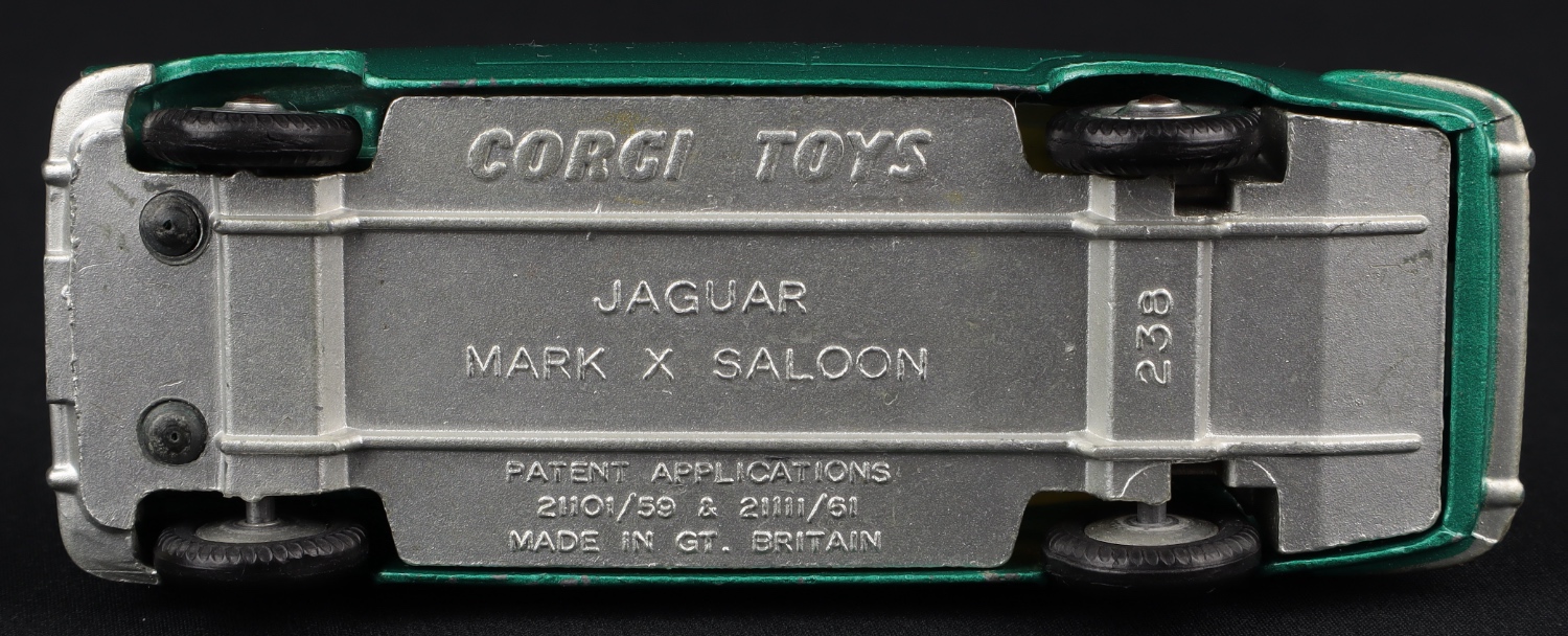 Jaguar Mark X by Corgi Toys, No. 238. Metallic emerald green issue with a LEMON INTERIOR. Rare - and a First for QDT! Very near mint/boxed. With two pieces of luggage. Nice box! From The Gower Collection. QDT starting bid £500. Please note that QDT apply 12.5% buyer's commission