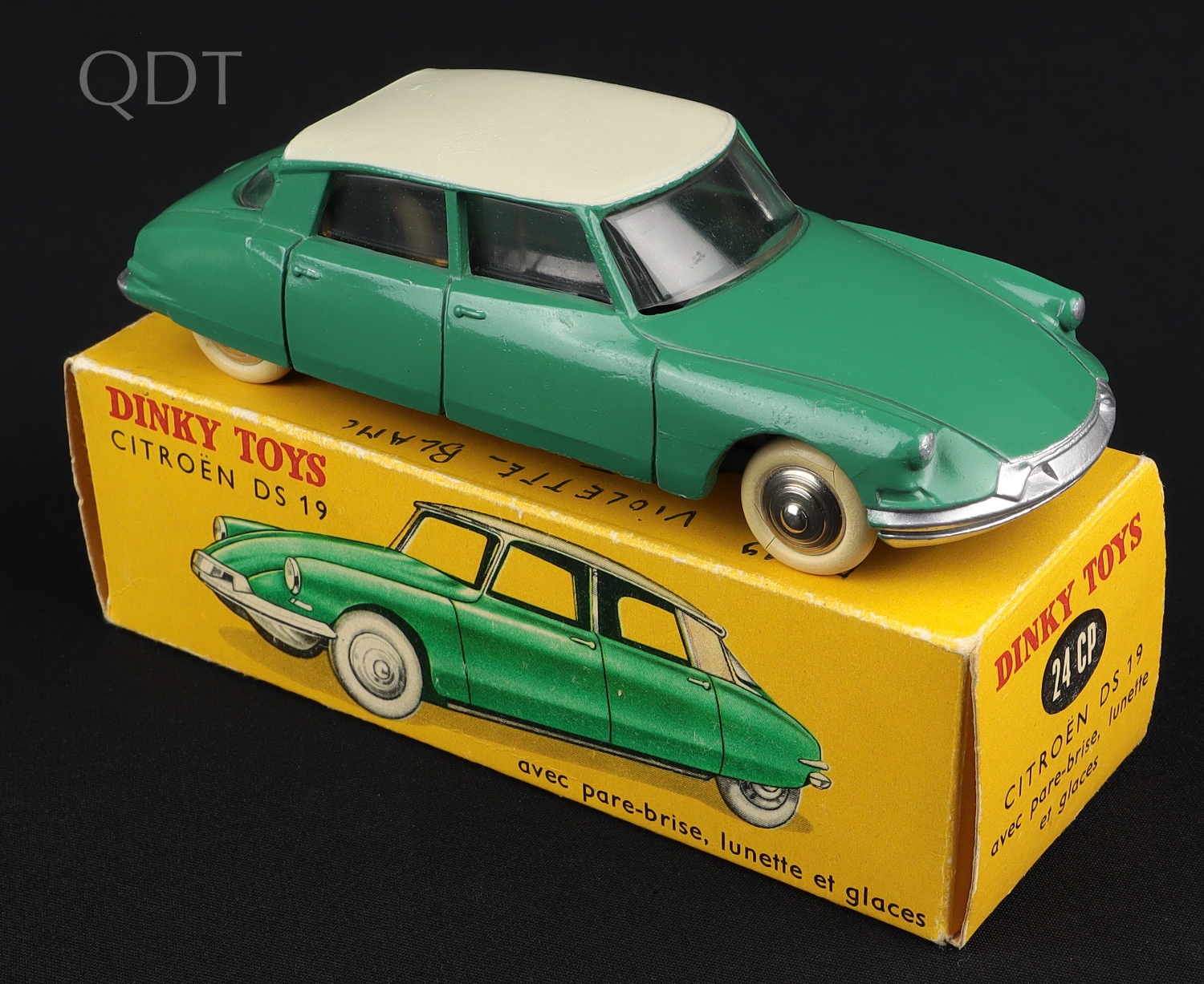 Citroen DS 19 by French Dinky Toys, No. 24CP. Very near mint/boxed. Green & very pale grey, with window glazing. Convex wheels. From The Dutch-Hillman Collection.